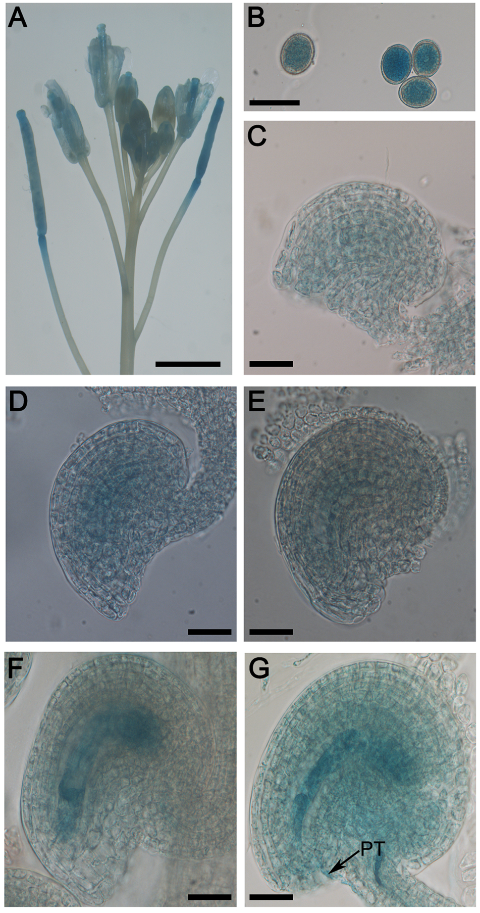 Expression patterns of RPS9M by GUS reporter analysis. Histochemical analysis of RPS9M promoter-driven GUS reporter expression in transgenic Arabidopsis plants. GUS signals (indicated in blue) were observed in inflorescence (A), pollen grains (B) and different developmental stages of female gametophytes (C–G). Inflorescence (A), mature pollen grains (B), FG1 stage (C), FG2-FG3 stage (D), FG4 stage (E), FG5–FG7 stage (F), ovule with penetrating pollen tube (PT, arrow) (G). Bars = 5 mm (A) and 20 μm (B–G).