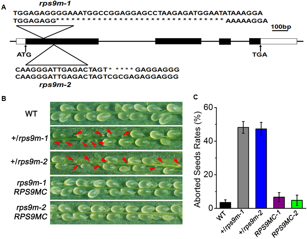 Phenotypic observation of +/rps9m siliques. (A) Schematic diagram of RPS9M gene structure and the mutation position in rps9m-1 and rps9m-2 mutant. The ATG start codon and TGA stop codon are shown as indicated. The mutation position and deleted nucleotides was determined to the first exon by PCR and sequencing (triangle above the gene diagram). (B) Phenotype of the +/rps9m plant. In contrast to wild type (upper), half of seeds in selfed +/rps9m-1 and +/rps9m-2 siliques were aborted during development (arrowheads, middle), whereas the complemented transgenic plants of rps9m-1 and rps9m-2 (RPS9MC1 and RPS9MC2) recovered the phenotype to the wild type level (lower). (C) Frequencies (%) of the aborted seeds in per silique of wild type, +/rps9m-1, +/rps9m-2 and RPS9MC1 and RPS9MC2 plants. Error bars represent ± SD.