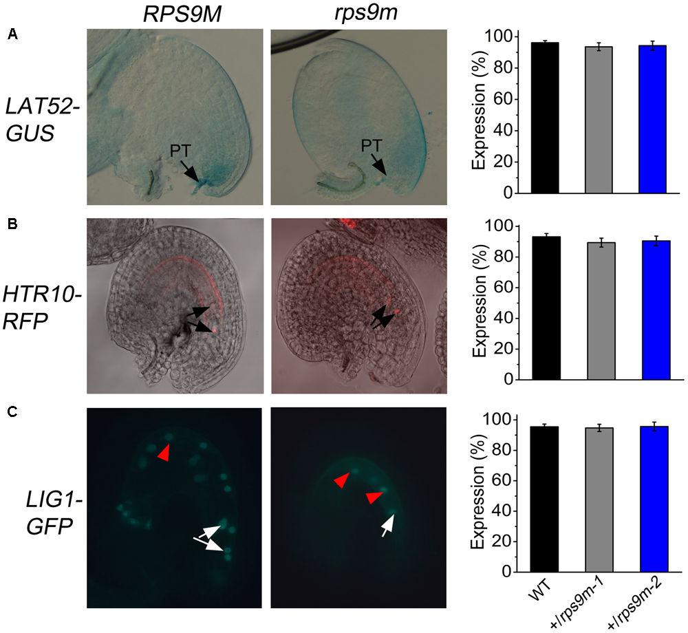 The observation of the pollen tube guidance of rps9m female gametophytes. (A) The attraction of rps9m female gametophyte to pollen tube determined by GUS reporter. Wild type and +/rps9m pistils were pollinated with LAT52-GUS pollens. Pollen tube entry into the female gametophytes was visualized by GUS staining at 1 DAP (black arrowheads). The percentages of GUS positive ovules per pistil in wild type and +/rps9m are shown. (B) The attraction of rps9m female gametophyte to pollen tube determined by RFP reporter. The pistils of wild type and +/rps9m plant were pollinated with pollens expressing sperm-specific marker HTR10-mRFP. Ovules were dissected from the pistils and observed by CLSM at 8–10 h after pollination. The arrowheads show two fertilized sperm nuclei. And the percentages of RFP positive ovules per pistils in wild type and +/rps9m were shown. (C) The fertilization of rps9m female gametophyte to sperms determined by GFP reporter. The pistils of wild type and +/rps9m plant were pollinated with LIG1-GFP pollens. Ovules were dissected from the pistils and observed at 24 h after pollination. The fertilized embryo or zygote are shown (white arrowheads) and endosperm nuclei are visible (red arrowheads). PT, pollen tube. Error bars represent ± SD. Bars = 20 μm.