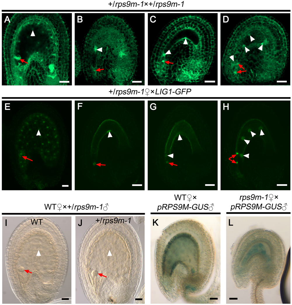 The zygote and early endosperm development in rps9m ovules after fertilization. (A–D) Observation of embryo and endosperm development in +/rps9m-1 siliques after fertilization. Pistils of +/rps9m-1 plant were pollinated with +/rps9m-1 pollens, and the seeds were observed at 2 DAP by CLSM. (A) Wild type seed showed normal embryo development and endosperm proliferation. (B) The seed arrested immediately after fertilization in +/rps9m-1 silique. (C) The seed arrested at zygotic embryo stage contain two endosperms in +/rps9m-1 silique. (D) The seed arrested at two-celled proembryo stage with four endosperms from +/rps9m-1 siliques. (E–H) Pistils of +/rps9m-1 plant were pollinated with wild type pollen expressing nucleus-specific marker LIG1-GFP. Ovules were dissected from the pistils and observed by CLSM at 2 DAP. GFP signals can be detected in all fertilized ovules. The RPS9M ovules developed normally (E), but rps9m-1 ovules arrested at different stages (F–H). (I,J) Seeds development after wild type female gametophytes were fertilized with +/rps9m-1 pollens. Both embryo and endosperms developed normally in wild type (I) and +/rps9m-1(J) seeds. (K,L) GUS staining of paternal expression of pRPS9M-GUS in the developing seeds. The wild type (K) or rps9m-1(L) female gametophyte were pollinated with pRPS9M-GUS pollens, and observed at 1 DAP. The red arrows indicate the embryos; the white arrowheads indicate the endosperm nuclei. Bars = 20 μm.