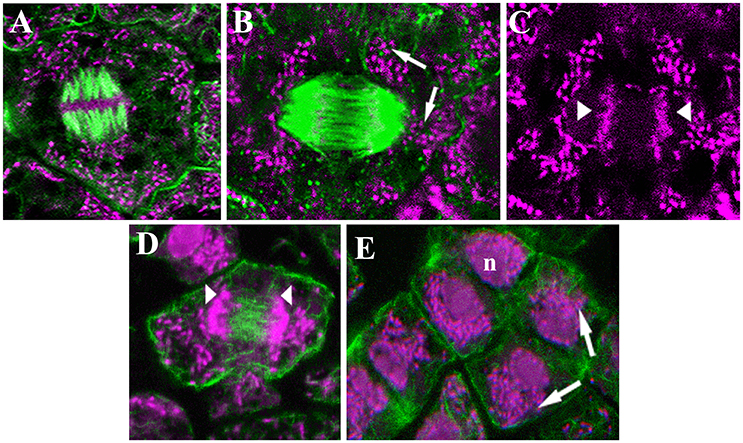 Figure 3. Confocal laser images of dividing infected cells of Lupinus albus nodules showing the cytoskeletal elements in green, and the DNA of bacteroids (arrow) and chromosomes (arrowhead) in magenta. (A–D) Metaphase, microtubules (A,B) and actin microfilaments (D). (E) Different anaphase–telophase stages showing the actin microfilaments. n, Nuclei. Images modified from Fedorova et al. (2007); they are being reproduced with permission from the copyright holder.