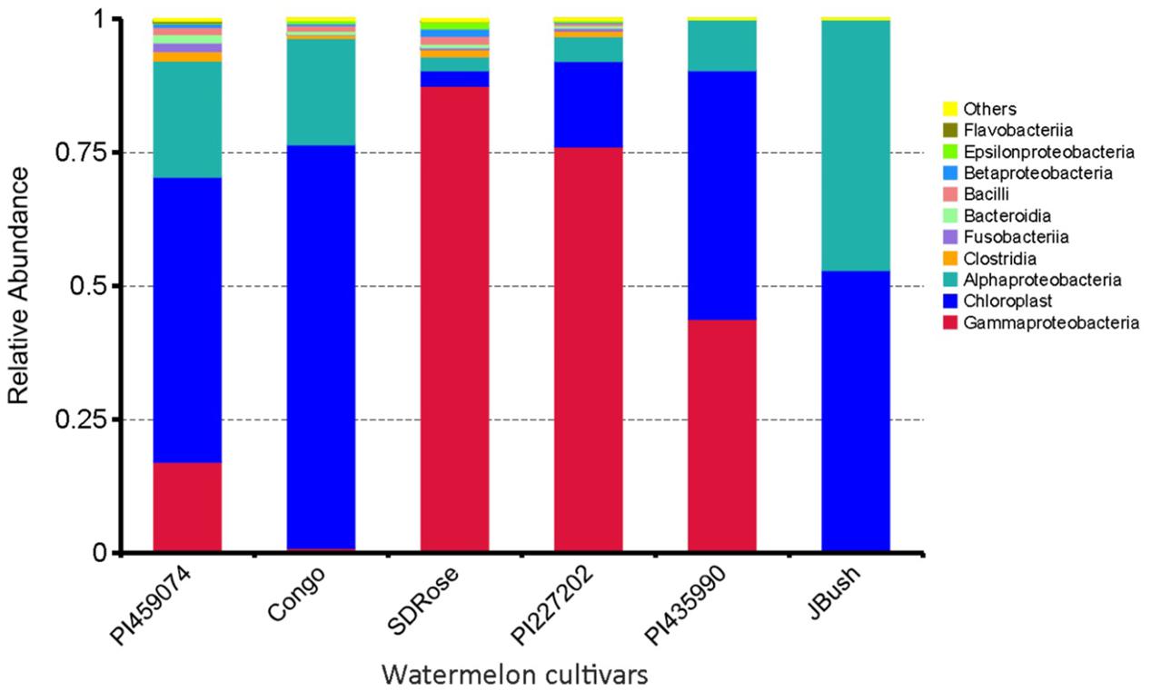 FIGURE 2. Bacterial community composition by class in ripe fruits of watermelon cultivars based on 16S rRNA analysis.