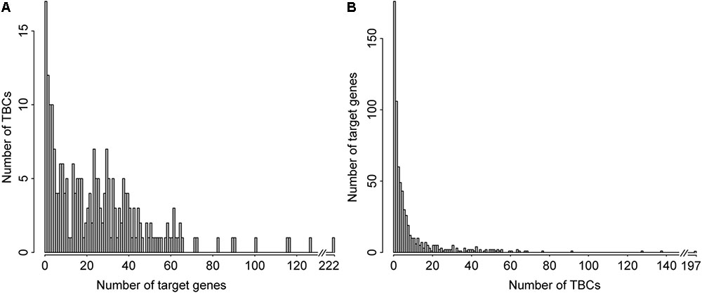FIGURE 4. Distribution of TBC and their target genes archived in TBC2target. Histogram of the number of target genes associated with individual TBC (A). Histogram of the number of TBCs associated with individual target gene (B).