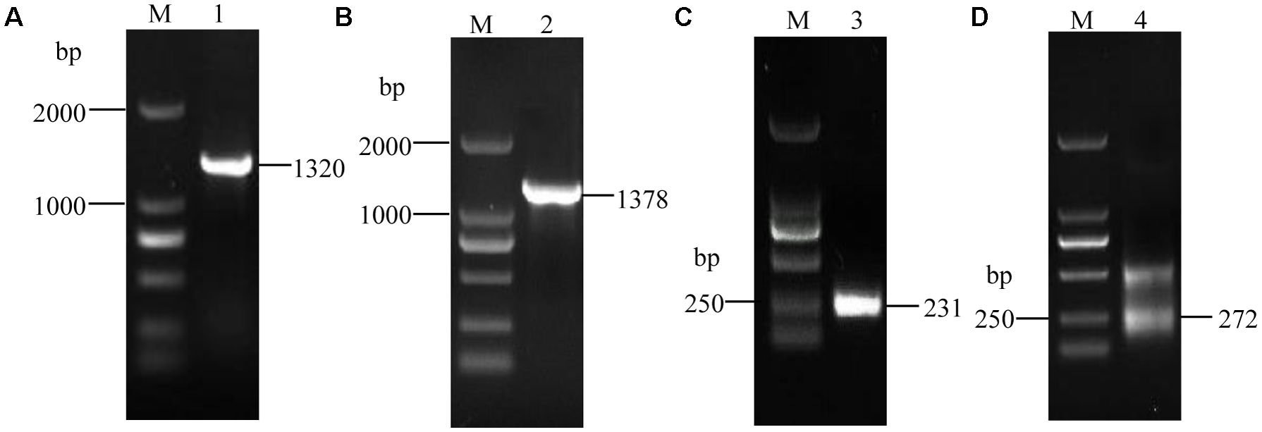 The electrophoretogram of VmXyl1 cloning process from the Valsa mali. (A) The RT-PCR amplification of the open reading frame of VmXyl1. The lane M represents DNA marker DL2000. In lane 1, a 1320 bp fragment was obtained using the primer pair VmXyl1F/VmXyl1R with the first-strand cDNA as a template. (B) The PCR amplification of DNA fragment of the VmXyl1. In lane 2, a 1378 bp fragment was obtained with genomic DNA as the template. (C) The cloning of VmXyl1 by the 3′-RACE. In lane 3, a 231 bp fragment was obtained with the primer pair Inner Primer/IN3RC. (D) The cloning of VmXyl1 by the 5′-RACE with the primer pair NGSP1/UPM. In lane 4, two fragments were obtained in the nested PCR and a 272 bp band was the 5′-end cDNA region of VmXyl1.
