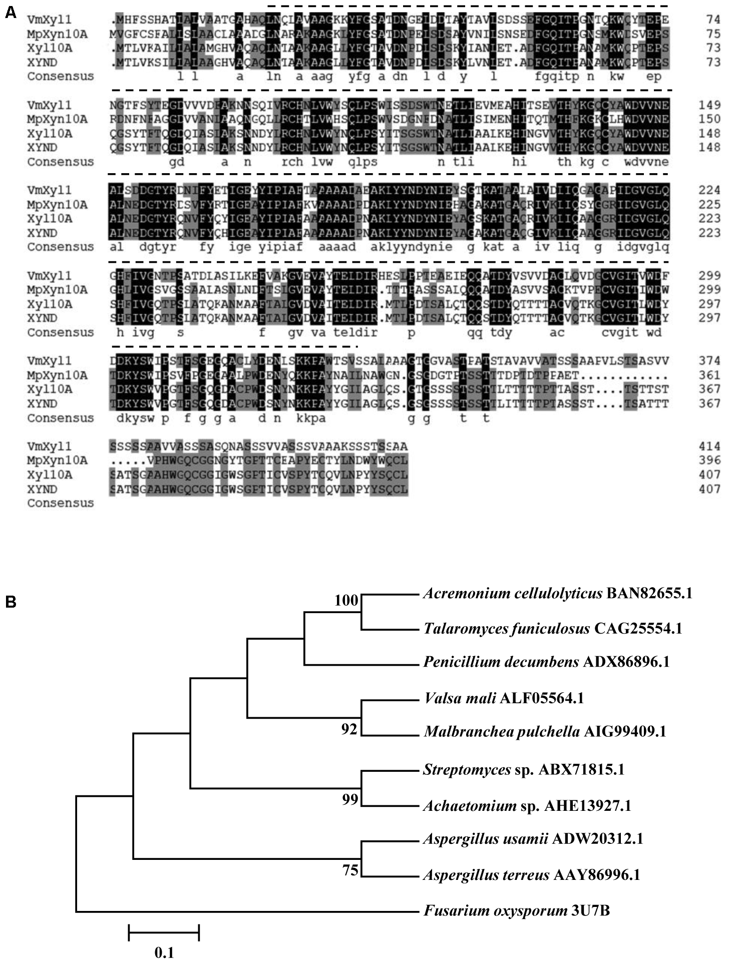 Multiple alignments and phylogenetic tree of the amino acid sequences of VmXyl1 in comparison to the sequences of other endoxylanases from family GH10. (A) Alignments of the VmXyl1 with three well-characterized endoxylanase proteins of the family GH10. Identical or similar residues are shown with black or gray background, respectively. Protein accession numbers are as follows: AIG99409.1 (Malbranchea pulchella, MpXyn10A), CAG25554.1 (Talaromyces funiculosus, XYND) and BAN82655.1 (Acremonium cellulolyticus, Xyl10A). (B) Phylogenetic analysis of VmXyl1 with nine well-characterized endoxylanase proteins of the family GH10. The sequences were analyzed using the ClustalW2 tool and the tree was generated by the Neighbor-Joining method using MEGA 5.1 software. Confidence levels above the nodes were obtained from a 1000 bootstrap analysis program. Species names are followed by accession numbers of endoxylanase genes.
