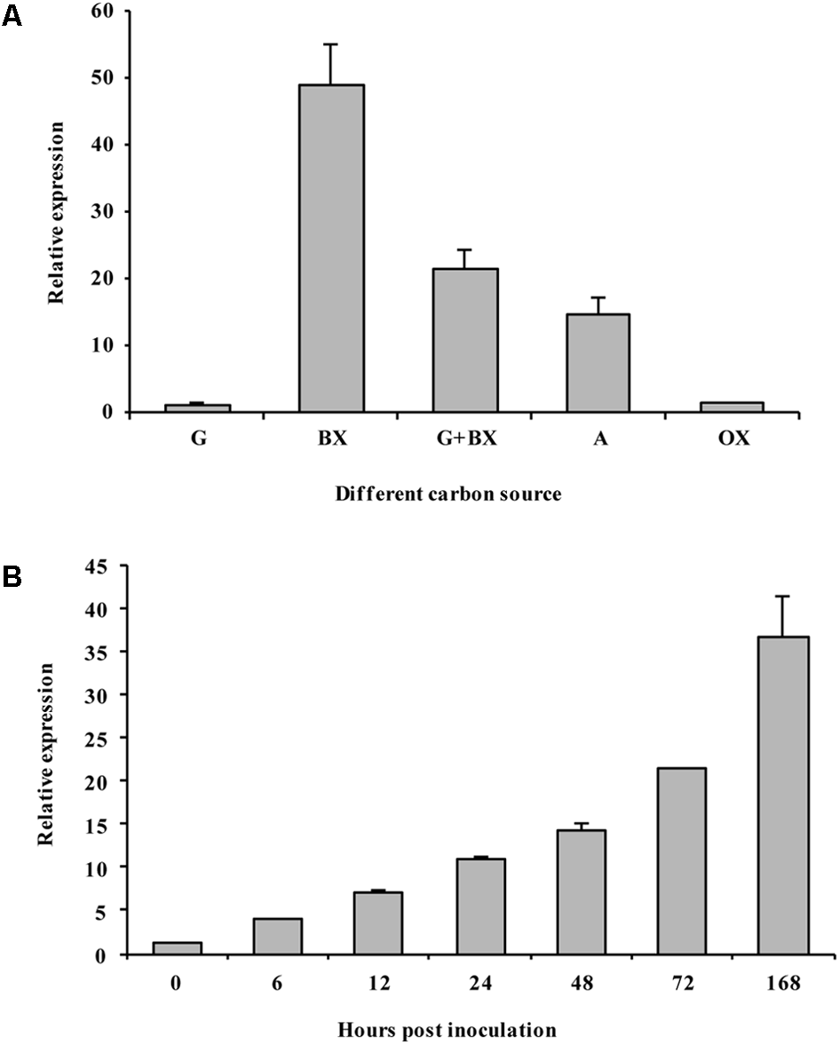 Interestingly, the expression pattern of VmXyl1 showed similarity to the gene that regulates the conversion of cell wall into low-molecular-weight easily assimilable sugars. Also, it was induced by the availability of beechwood xylan and not by the glucose. Previously, few studies have shown the expression of fungal xylanases using xylan, such as xyn11A of B. cinerea, and xyl5 of F. oxysporum, whereas xyl5 was detected only on oat spelt xylan but not on larchwood xylan (Gómez-Gómez et al., 2001; Brito et al., 2006). Here, beechwood, but not oat spelt xylan, induced the VmXyl1. The results indicate a considerable degree of specificity in the substrate regulation of VmXyl1 expression, which may be due to the structural diversity of plant xylans (Gómez-Gómez et al., 2001).