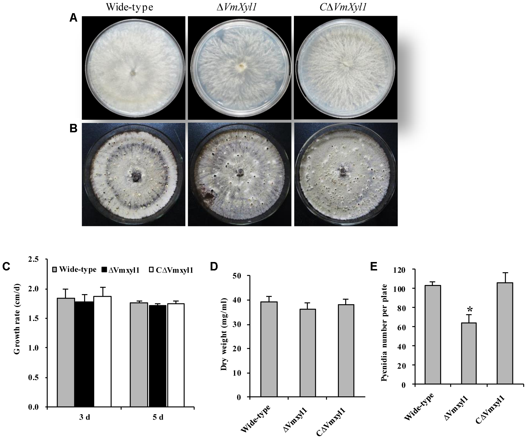 The growth and development of wild-type and mutants. (A) The colony phenotype of the wild-type, ΔVmXyl1 and CΔVmXyl1 strains growing on potato dextrose agar (PDA) medium at 25°C for 5 days. (B) Pycnidia formation of strains on PDA medium induced by the UV-light (365 nm) at 25°C for 30 days. (C) The growth rate of strains on PDA medium. (D) The mycelial dry weight of strains in potato dextrose broth (PDB) medium for 7 days with 150 rpm/min at 25°C. (E) Number of pycnidia produced in 9 cm per petri plates. Bars indicate standard deviation of means of three technical replicates. Asterisk on bars indicate a significant difference with the wild-type strain (P < 0.05).