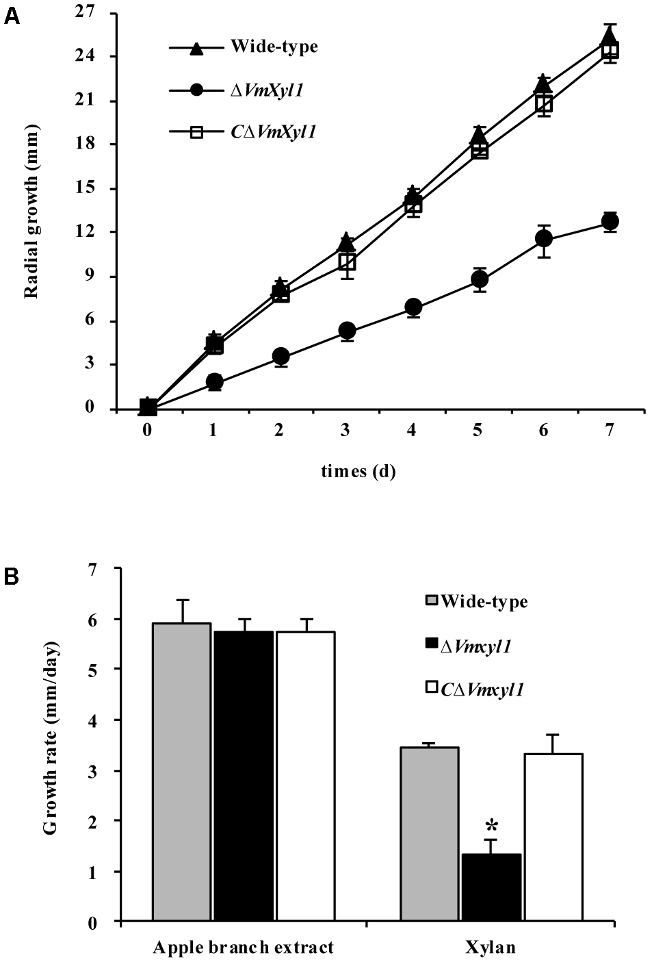 The growth of VmXyl1 mutants in the medium containing beechwood xylan as a sole carbon source. (A) The radial growth of wild-type, ΔVmXyl1 and CΔVmXyl1 strains in the petri dishes containing beechwood xylan was determined by measuring the colony diameters daily. (B) The growth rate was calculated for each strain on minimal medium containing either apple branch extract or beechwood xylan as sole carbon sources. Values plotted represent the mean and standard deviation of three technical replicates. Asterisks on bars indicate a significant difference with the wild-type strain (P < 0.05).