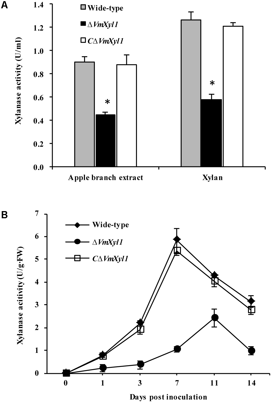 Effect of VmXyl1 deletion on the β-1,4-xylanase activity. (A) Xylanase activity was determined in the medium containing apple branch extract or beechwood xylan as sole carbon source for wild-type, ΔVmXyl1 and CΔVmXyl1 strains after 3 days of growth. The xylanase activity was expressed as units per min per ml (U/ml). (B) The xylanase activity of wild-type, ΔVmXyl1 and CΔVmXyl1 strains recorded at different time intervals during infection. The xylanase activity was expressed as units per min per gram of fresh weight (U/g⋅FW).