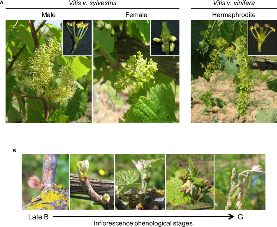 Flower organ development is under the control of highly specialized genetic networks that have been well studied during the past decades (Wellmer and Riechmann, 2010; O’Maoileidigh et al., 2014). The genus Vitis presents a notorious variability of flower types. The flowers of the cultivated V. v. vinifera are mainly hermaphrodite, while the wild type, V. v. sylvestris is dioecious with male plants producing flowers with erect stamens but without pistils and female plants displaying flowers with a fully formed pistil but reflexed stamens with infertile pollen (Valleau, 1916; Carmona et al., 2008; Ramos et al., 2014). The shift in sexual system from dioecy to hermaphroditism in Vitis species is not yet completely understood.