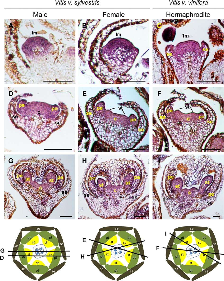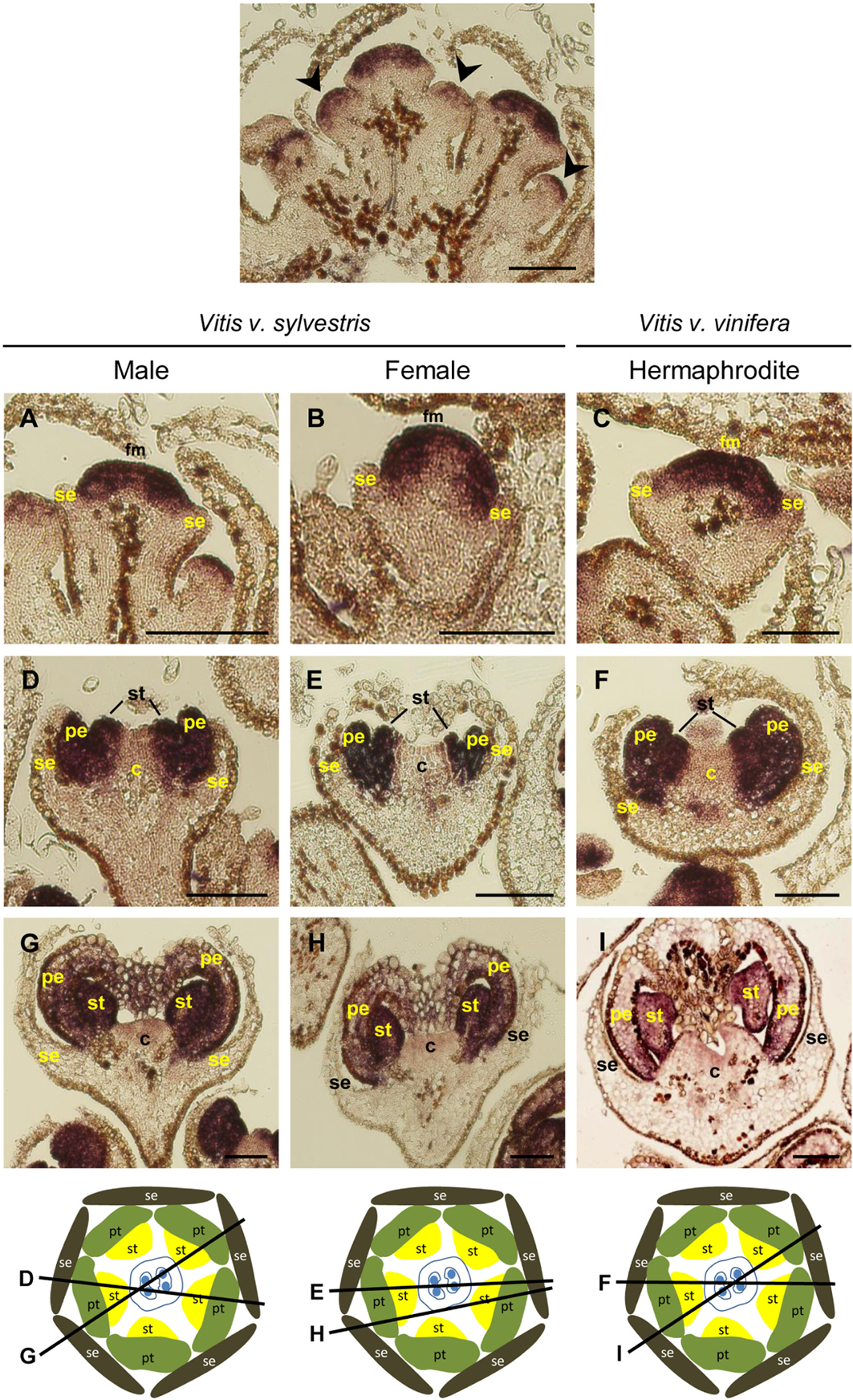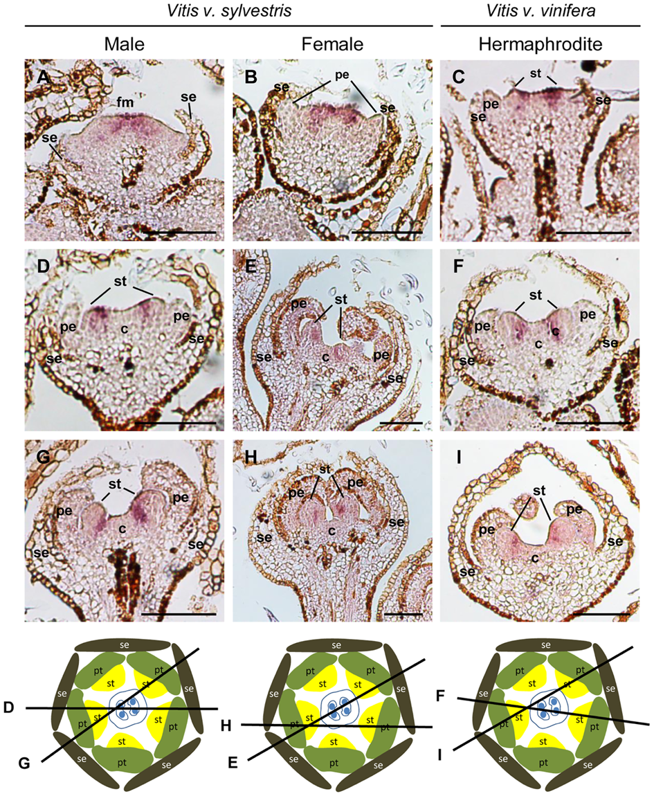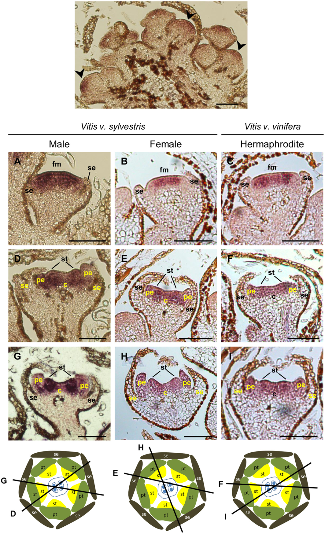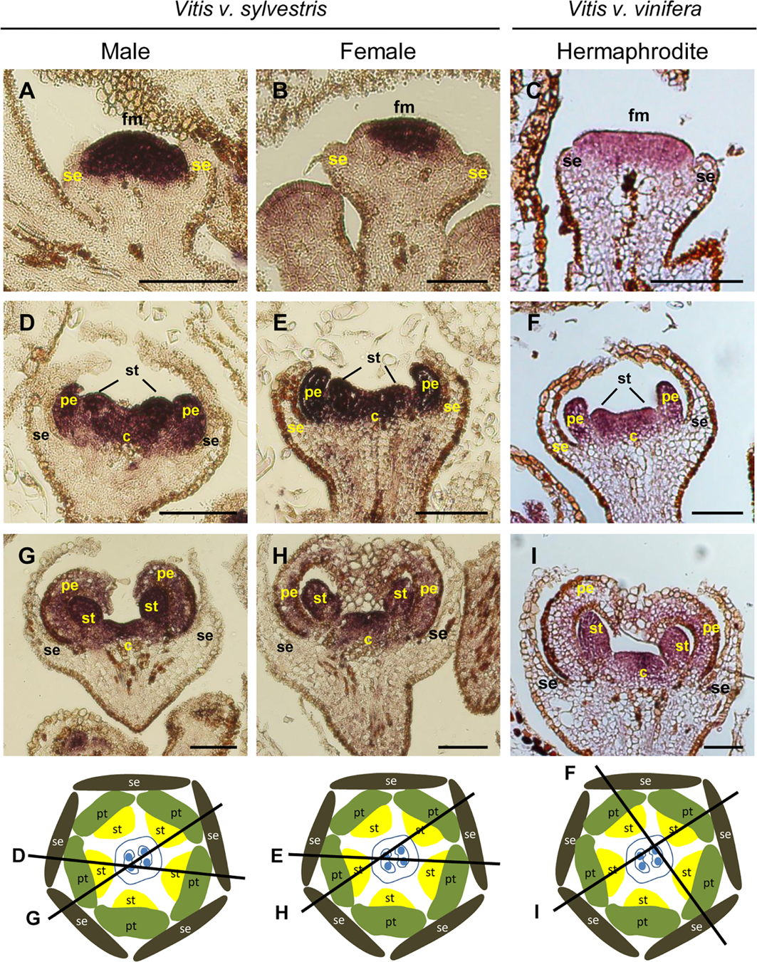 In situ hybridization of E- class gene VviSEPALLATA3 (VviSEP3) in developing flowers. VviSEP3 (VIT_01s0010g03900) expression analysis on longitudinal sections of wild and hermaphrodite Vitis inflorescences. Male: A,D,G; Female: B,E,H; Hermaphrodite (Her): C,F,I. VviSEP3 expression is similar in the three flower types throughout flower development. VviSUP3 is first detected in the central dome of the flower (A–C). When petals emerge VviSEP3 expression is excluded from the first whorl (D–F). In later development stages VviSEP3 remains in the second, third and fourth whorls (G–I). The diagrams represent cross sections with the corresponding figure indicated on each line. Abbreviations are as follows: fm, flower meristem; se, sepals; pe, petals; st, stamens; c, carpel. Scale bar, 100 μm.