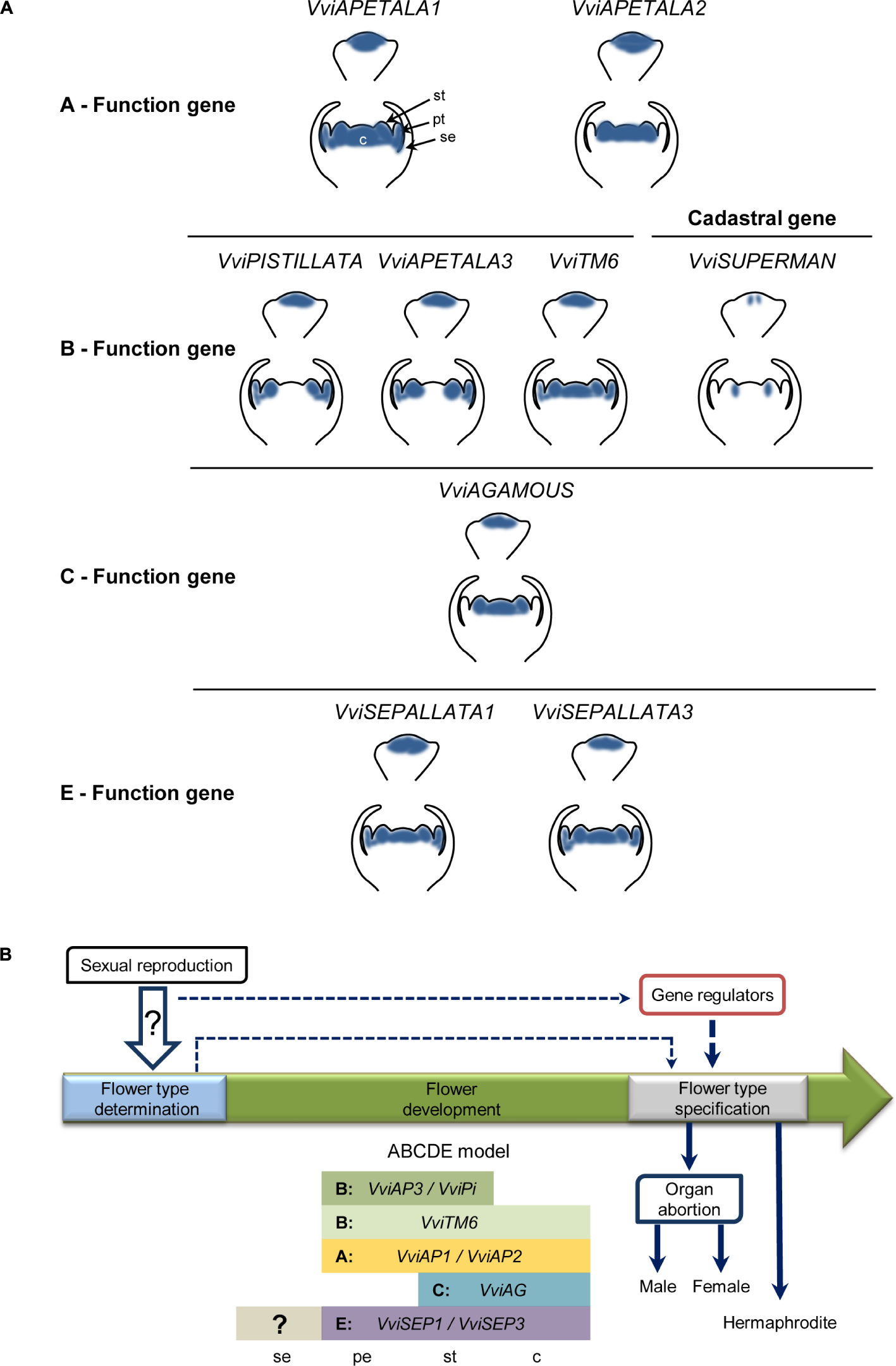 The ABCDE model genes are good candidates to be involved in the establishment of male and female flowers in dioecious species, particularly the B- and C- class genes due to their role in reproductive organ identity. Therefore, it is essential to analyze the expression of these genes in a systematic way, regarding the temporal and spatial dynamics throughout flower development in male, female and hermaphrodite Vitis plants.