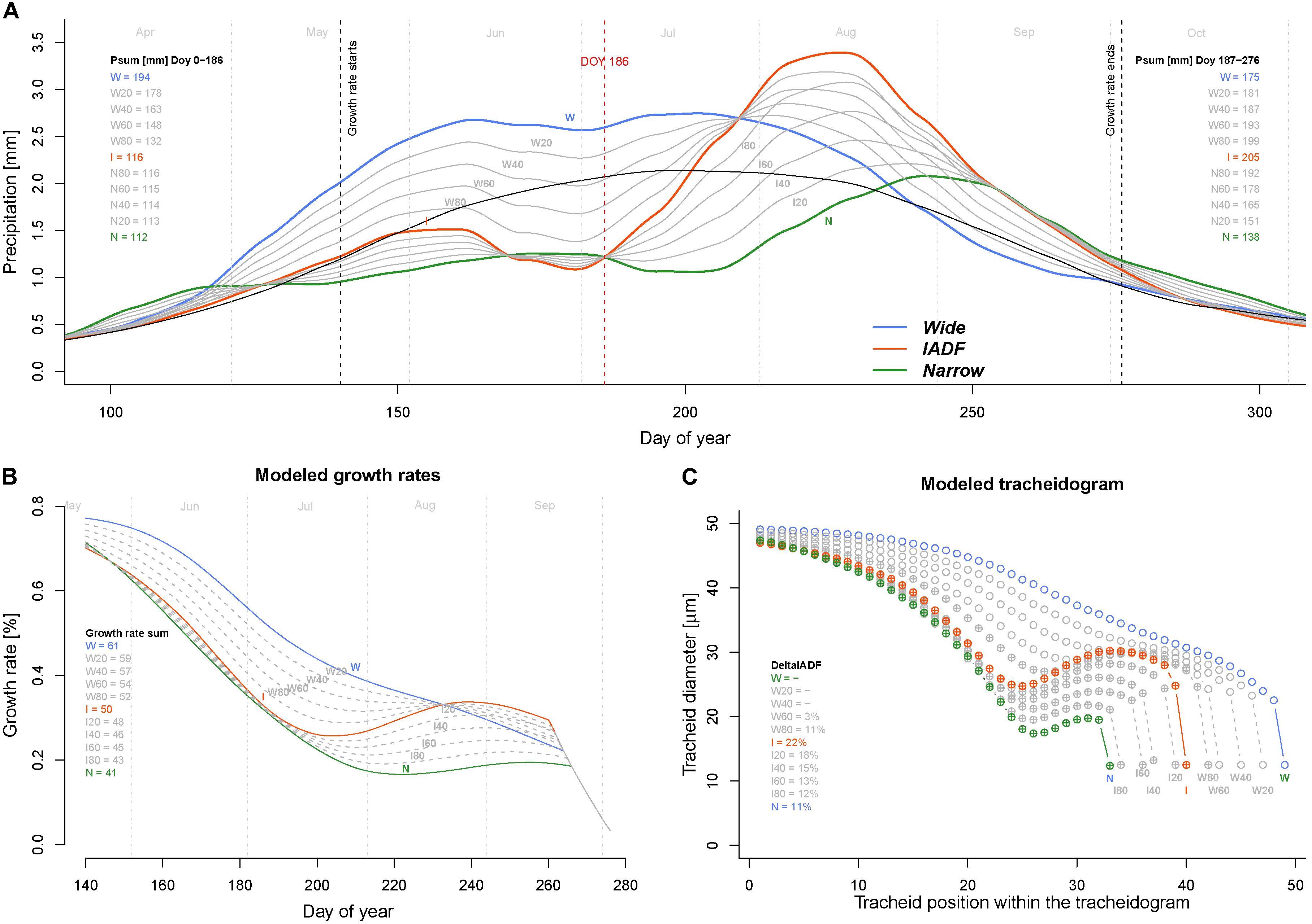 FIGURE 5. Exploring climatic scenarios generating IADF. (A) Averaged and LOESS smoothed (span = 0.3) daily precipitation of each ring type (thick colored lines) and their progressive transition between groups (in 20% steps) between W–I and I–N (thin gray lines) used to run the model (with group average daily temperature). The black line indicates the average precipitation over the period 1960–2013. Psum (mm) Doy 0–186 = precipitation sum between DOY 1 and 186 (middle of the growing season); Psum (mm) Doy187–276 = precipitation sum between DOY 187 and 276 (end of the growing season). (B) Obtained daily growth rates. The legend quantifies the growth rates sum (%) for each climatic scenario. (C) Derived modeled tracheidograms for each precipitation scenario. Tracheidograms with filled circle display a L+IADF according to the definition given in Figure 2B. The legend quantifies the DeltaIADF (%) for each climatic scenario. N = narrow rings (green); W = wide rings (blue); I = IADF rings (red). W20–W80 and I20–I80 indicate the 20% steps of precipitation change between W–I and I–N, respectively.