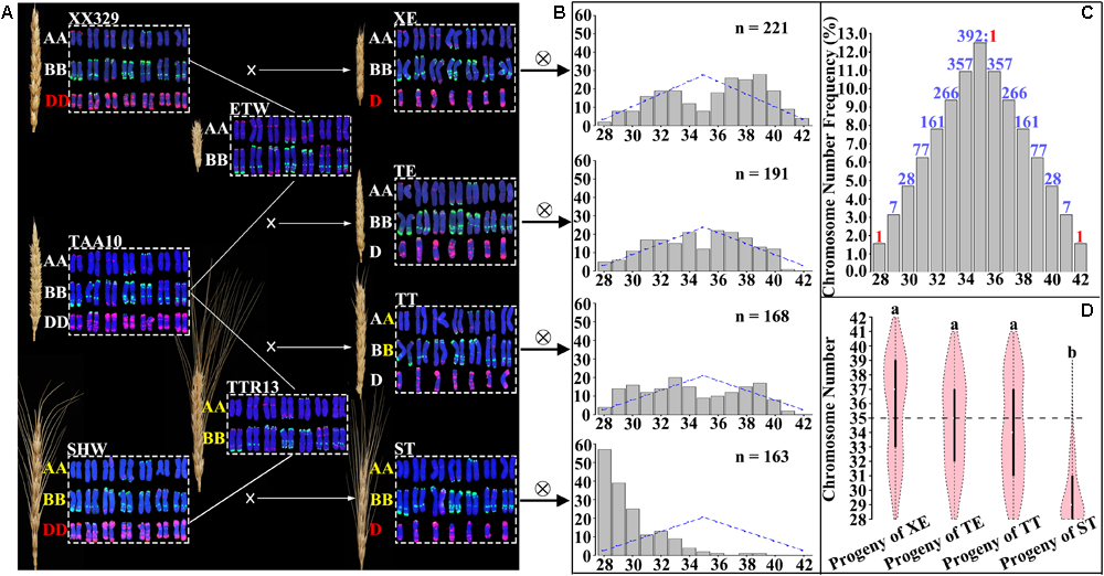 Four different pentaploid wheat lines generated by crossing three hexaploid wheat genotypes with two tetraploid wheat genotypes, and the overall chromosome number distributions in the immediate progeny swarms of the pentaploids. (A) FISH-based karyotypes and spike morphology of hexaploid wheat, tetraploid wheat and pentaploid wheat. PSc119.2 (green coloration) and pAs1 (red coloration) were used as FISH probes. Subgenome designations (A,B,D) in the same and different colored fonts denote that they were from the same source or difference sources. (B) Theoretically expected (blue lines) and observed (gray bar) plant numbers in each of the immediate progenies of the four pentaploid wheat lines. Expected values were obtained by transforming the total karyotyped plant number according to the expected frequency in (C). The numbers of observed (karyotyped) individuals in each F2 population are given. The x-axis is the chromosome number. (C) Theoretical (expected) chromosome number distribution in the immediate progeny swarms of pentaploid wheat. The numbers on the top of the gray bars refer to the expected values in each of the chromosome number categories belonging to either aneuploidy (colored blue) or euploidy (colored red). (D) Comparison of the overall chromosome number distributions among the immediate progeny swarms of the four pentaploid wheat lines. Letters above each vioplots denote statistical significance of pairwise comparisons (Var. test, P-values < 0.05).