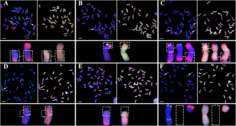 Representative structural chromosome variations (SCVs) in the immediate progenies of the pentaploid wheat lines. (A) Telocentrics, (B) Inter-subgenome translocations, (C) Intra-subgenome translocations, (D) Isochromosomes, (E) Truncations, and (F) Telocentrics coupled with monosomic 2B (loss of one 2B chromosome). In (A) through (F), the FISH images (left of each panel pair) are signals of pSc119.2 (green) and pAs1 (red), while the GISH images (right of each panel pair) are the signals of A subgenome (green), D subgenome (red), and B subgenome (blue), respectively. Structural variant chromosomes (marked by arrows) are zoomed in and shown below the images accordingly; while the dashed-lined empty frames in (F) refer to loss of one 2B chromosome (monosomic 2B). In all images, the bars = 10 μm.