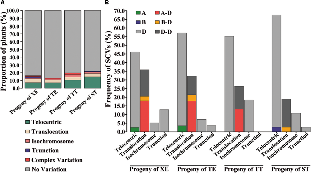 We also detected NCVs, i.e., aneuploidy, concerning the A and B chromosomes in small proportions of the progeny swarms of all four pentaploid wheat lines (Supplementary Table S1). The NCVs may involve gain or loss of one or more chromosomes of either the A or B subgenome, or simultaneous gain and loss of chromosomes involving both A and B subgenomes (Supplementary Table S1). Notably, sometimes, aneuploidies of the A and/or B chromosomes were accompanied with gain of extra D chromosomes (i.e., one D chromosomes being at three copies). Collectively, the A and B chromosome aneuploidies accounted for 5.1% (12 of 234), 2.0% (4 of 196), 7.2% (13 of 181), and 3.0% (5 of 169) of the karyotyped progeny plants derived from the XE, TE, TT, and ST pentaploid lines (Supplementary Table S1).