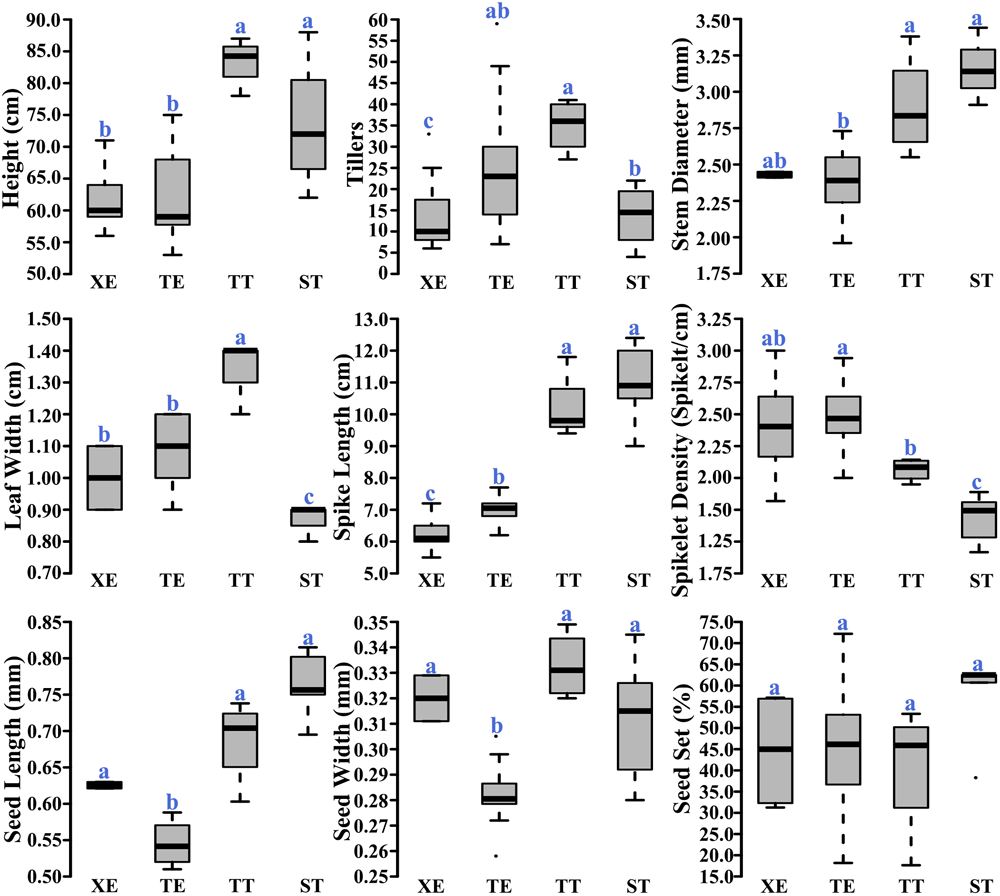 Comparisons of the nine phenotypic traits among the four immediate progeny swarms of the pentaploid wheat lines. Letters above the boxplots denote statistical significance of the pairwise comparisons (Wilcox. test, P-value < 0.05).
