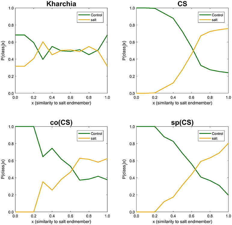 Figure 10. Posterior probability of belonging to control and salt classes given similarity to salt endmember. Posterior probability was calculated for each individual 10 bins of similarity to salt endmember.