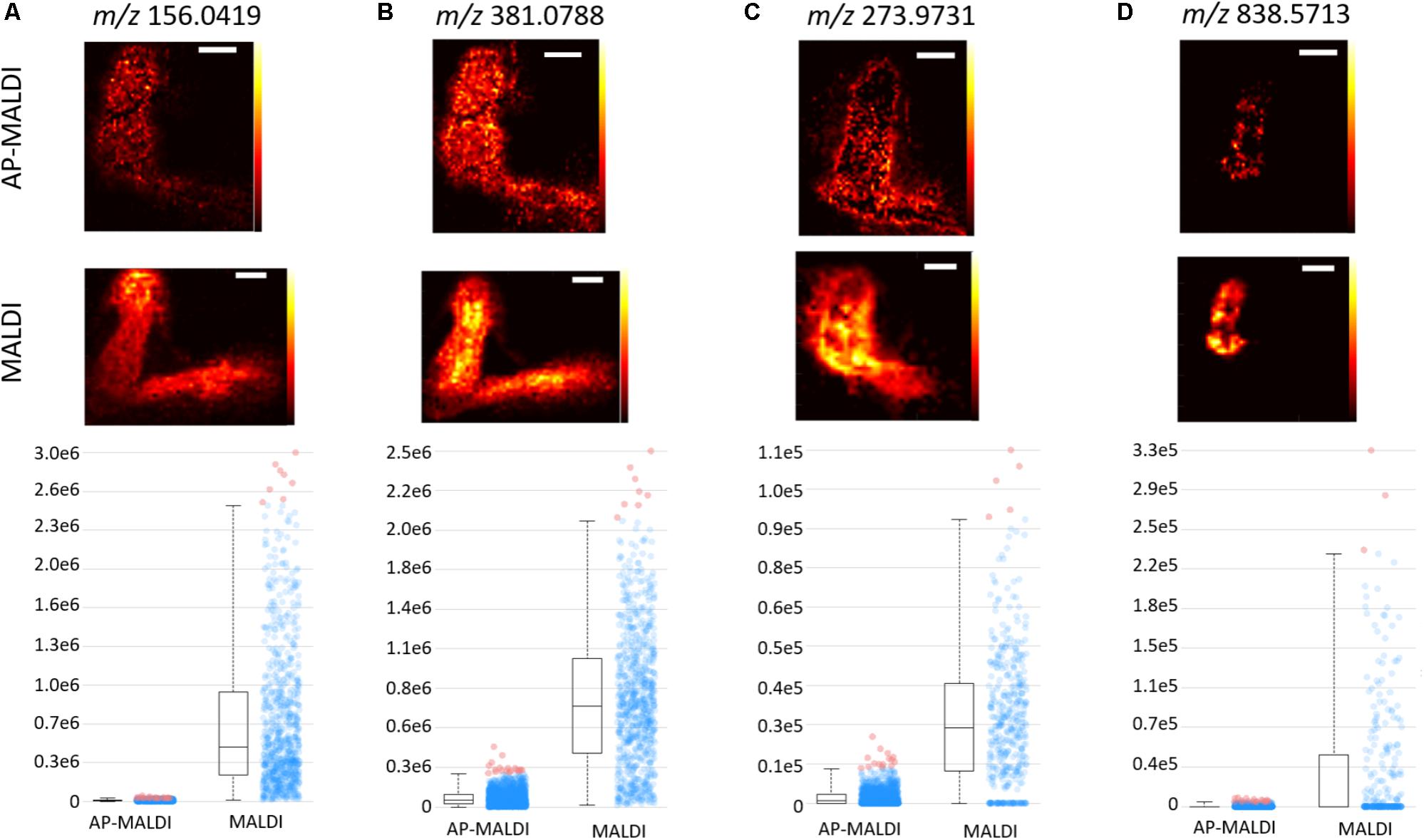 FIGURE 3. Comparison of images detected in both the AP-MALDI and MALDI platforms. Each part in (A–D) depicts a different m/z with a ±5 ppm window. For each part, the AP-MALDI image is shown on the top, the MALDI image in the middle, and the box and whisker plot on the bottom. (A,B) Are from the DHB matrix data and (C,D) are from the CHCA matrix data. The white scale bar corresponds to 1 mm.