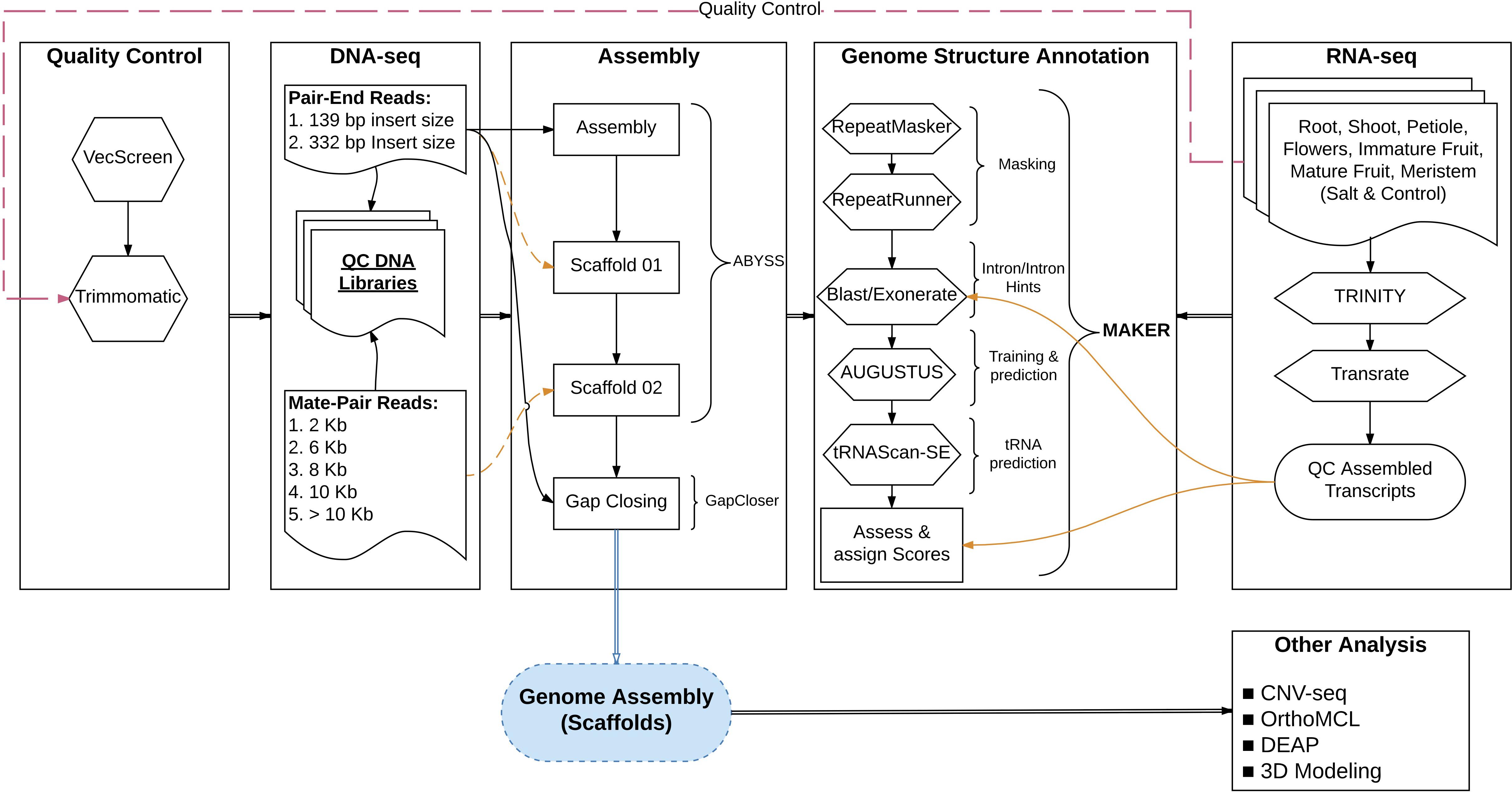The S. pimpinellifolium accession ‘LA0480’ was sequenced using the HiSeq 2000 Illumina platform at King Abdullah University of Science and Technology (KAUST) (Figure 8). DNA was extracted from whole flowers of a single soil-grown plant ‘LA0480-ref’ using the Qiagen DNeasy Plant Mini Kit (Qiagen, Germany). Two 101 bp paired-end (PE) short-read libraries (139 and 332 bp mean insert length) and five 100 bp mate-pair libraries (2, 6, 8, 10, and >10 kb insert length) were prepared using the NEBNext Ultra DNA Library Prep Kit and the Nextera Mate-pair Library Kit, respectively (New England Biolabs, United Kingdom).