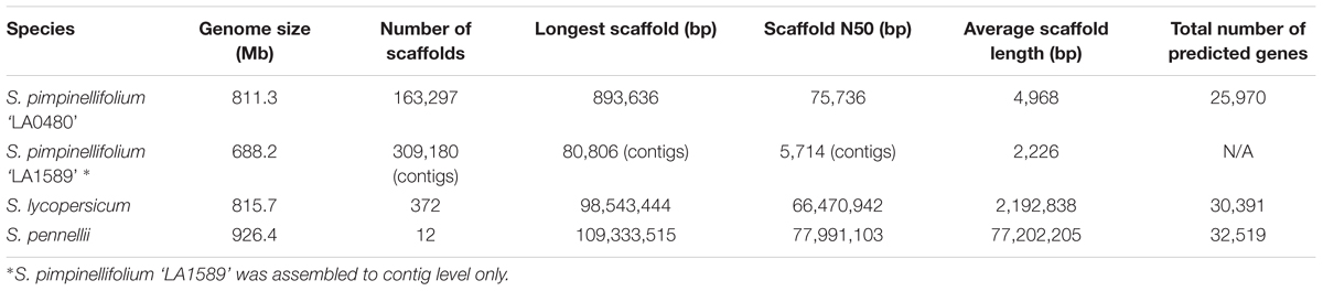 TABLE 2. Genome assembly and annotation statistics for S. pimpinellifolium ‘LA0480’ in comparison to S. pimpinellifolium ‘LA1589’ (The Tomato Genome Consortium, 2012), S. lycopersicum (The Tomato Genome Consortium, 2012), and S. pennellii (Bolger A. et al., 2014).