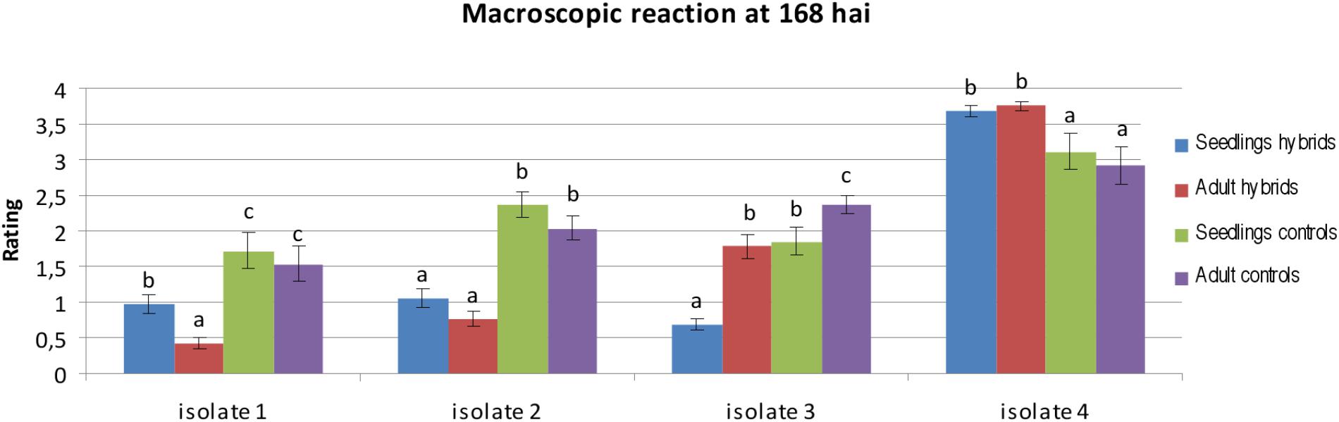 FIGURE 3. Statistical analysis of macroscopic reaction of hybrids carrying leaf rust resistance genes (hybrids) and control plants (controls) inoculated with single spore isolates at 168 hai at the seedling and adult plant stage. The bars represent a mean value (over replications) and error bars represent standard errors. The letters indicate homogenous groups of means that do not differ significantly at a significance level of 0.05 (Fisher’s LSD-test).