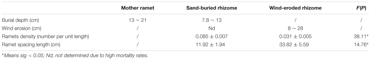 Clonal ramets that sprouted from sand-buried and wind-eroded horizontal rhizomes had significantly different clonal growth characters. Ramet density was much greater from sand-buried than from wind-eroded rhizomes (P < 0.05), although spacer length showed a contrary result (P < 0.05) (Table 3).