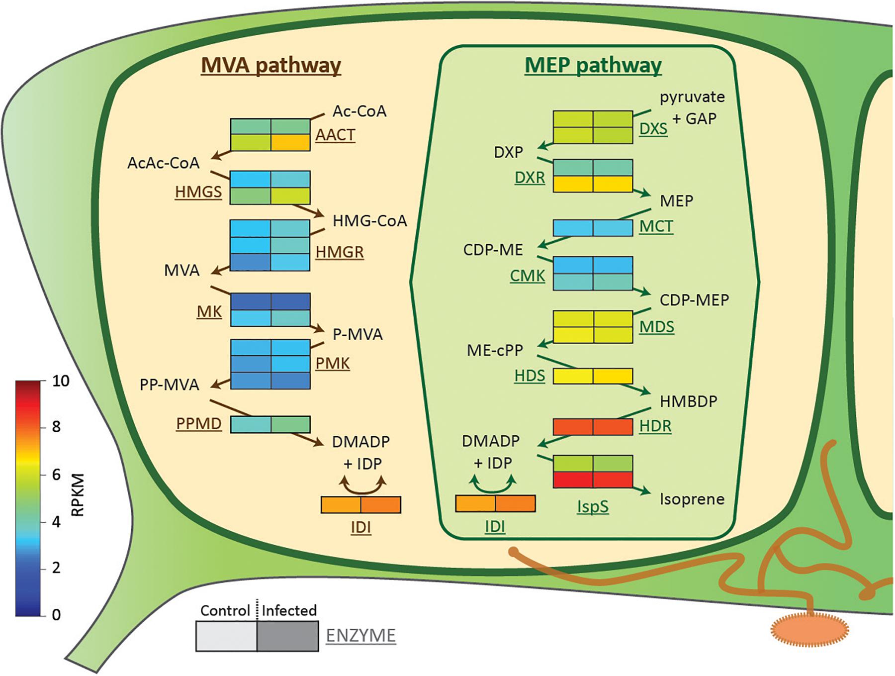 FIGURE 5. Expression of biosynthetic genes of the two isoprenoid pathways in black poplar leaves from rust-infected trees (“Infected,” right box) compared to uninfected controls (“Control,” left box). Shown are RPKM (reads per kilobase of transcript per million mapped reads) values of contigs annotated as enzymes of the MVA and MEP pathways (n = 4 biological replicates). Each row with two boxes (Control and Infected) represents one contig. Metabolites (in black): acetyl coenzyme A (CoA) (Ac-CoA), acetoacetyl coenzyme A (AcAc-CoA), 3-hydroxy-3-methylglutaryl coenzyme A (HMG-CoA), mevalonate (MVA), mevalonate-5-phosphate (P-MVA), mevalonate-5-diphosphate (PP-MVA), dimethylallyl diphosphate (DMADP), isopentenyl diphosphate (IDP), D-glyceraldehyde-3-phosphate (GAP), 1-deoxy-D-xylulose-5-phosphate (DXP), 2C-methyl-D-erythritol-4-phosphate (MEP), 4-diphosphocytidyl-2C-methyl-D-erythritol (CDP-ME), 4-diphosphocytidyl-2C-methyl-D-erythritol-2-phosphate (CDP-MEP), 2C-methyl-D-erythritol-2,4-cyclodiphosphate (MEcDP), and 1-hydroxy-2-methyl-2-(E)-butenyl-4-diphosphate (HMBDP). Enzymes (in brown/green): AcAc-CoA thiolase (AACT), HMG-CoA synthase (HMGS), HMG-CoA reductase (HMGR), mevalonate kinase (MK), phosphomevalonate kinase (PMK), diphosphomevalonate decarboxylase (PPMD), isopentenyl-diphosphate isomerase (IDI), DXP reductoisomerase (DXR), MEP cytidyltransferase (MCT), CDP-ME kinase (CMK), MEcDP synthase (MDS), HMBDP synthase (HDS), and HMBDP reductase (HDR).