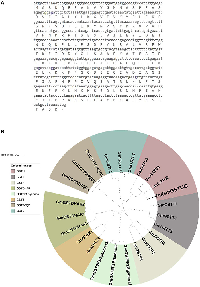 Figure 4. Sequence and phylogenetic analysis (A). Nucleotide and amino acid sequence of the PvGmGSTUG (B). Phylogenetic analysis of PvGmGSTUG with representative members from all classes of the Glycine max GST family. Sequences were aligned with the CLUSTAL Omega sequence alignment program (Sievers et al., 2011) and the phylogenetic tree was constructed using Geneious 9.1.2 software (http://www.geneious.com; Kearse et al., 2012) with the UPGMA tree building method and iTOL v1.0 software (Ciccarelli et al., 2006). Various classes can be distinguished: Phi (GSTF), Tau (GSTU), Lambda (GSTL), Theta (GSTT), Dehydroascorbate reductase (DHAR), Elongation factor 1Bγ (EF1Bγ), Zeta (GSTZ), and Tetrachloro-hydroquinone dehalogenase (TCHQD). The accession numbers of Glycine max GSTs that were used for this phylogenetic tree are: Phi class: GmGSTF1 (AJE59615.1), GmGSTF2 (AJE59616.1), GmGSTF3 (AJE59618.1), Tau class: GmGSTU1 (AJE59646.1), GmGSTU2 (AJE59647.1), GmGSTU3 (AJE59651.1), Lambda class: GmGSTL1 (AJE59633.1), GmGSTL2 (AJE59634.1), GmGSTL3 (AJE59635.1), Theta class: GmGSTT1 (AJE59641.1), GmGSTT2 (AJE59642.1), GmGSTT3 (AJE59643.1), DHAR class: GmGSTDHAR1 (AJE59631.1), GmGSTDHAR2 (AJE59630.1), GmGSTDHAR3 (AJE59629.1), EF1Bgamma class: GmGSTEF1Bgamma1 (AJE59625.1),GmGSTEF1Bgamma2 (AJE59626.1), GmGSTEF1Bgamma3 (AJE59627.1) Zeta class: GmGSTZ2 (AJE59689.1), GmGSTZ1 (AJE59691.1) TCHQD class: GmGSTTCHQD1 (AJE59638.1), GmGSTTCHQD2 (AJE59639.1), and GmGSTTCHQD3 (AJE59640.1).