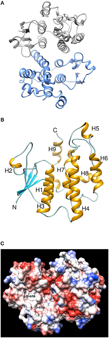 Figure 9. Ribbon representation and Coulombic surface analysis of the PvGmGSTUG dimer. (A) Ribbon representation of the PvGmGSTUG dimer. Each subunit is shown in a different color. The two-fold axis that relates the two subunits is perpendicular to the plane of the page. (B) Ribbon representation of PvGmGSTUG subunit. Helices and strands are shown in orange and cyan, respectively. The helices are labeled. The figures were using CHIMERA (Pettersen et al., 2004). (C) Coulombic surface analysis of PvGmGSTUG dimer. The analysis was carried out using UCSF Chimera (http://www.cgl.ucsf.edu/chimera). The Coulomb electrostatic surface shows regions of neutral (white), positive (blue), and negative (red) charge.