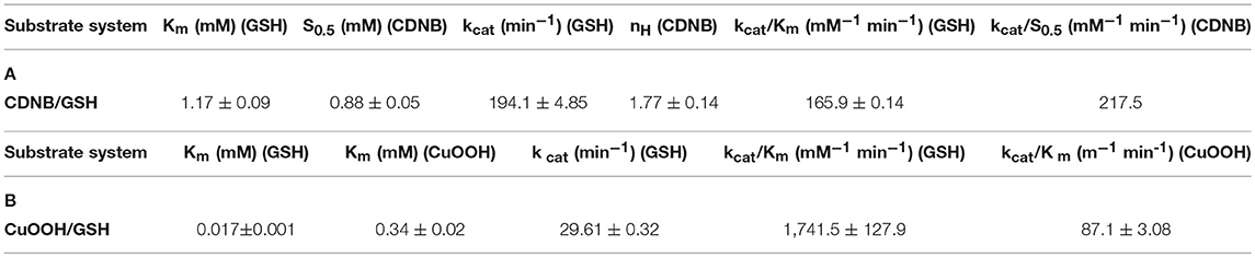 Table 4. Steady-state kinetic parameters of PvGmGSTUG for the CDNB/GSH substrate system (A) and for the CuOOH/GSH substrate system (B).