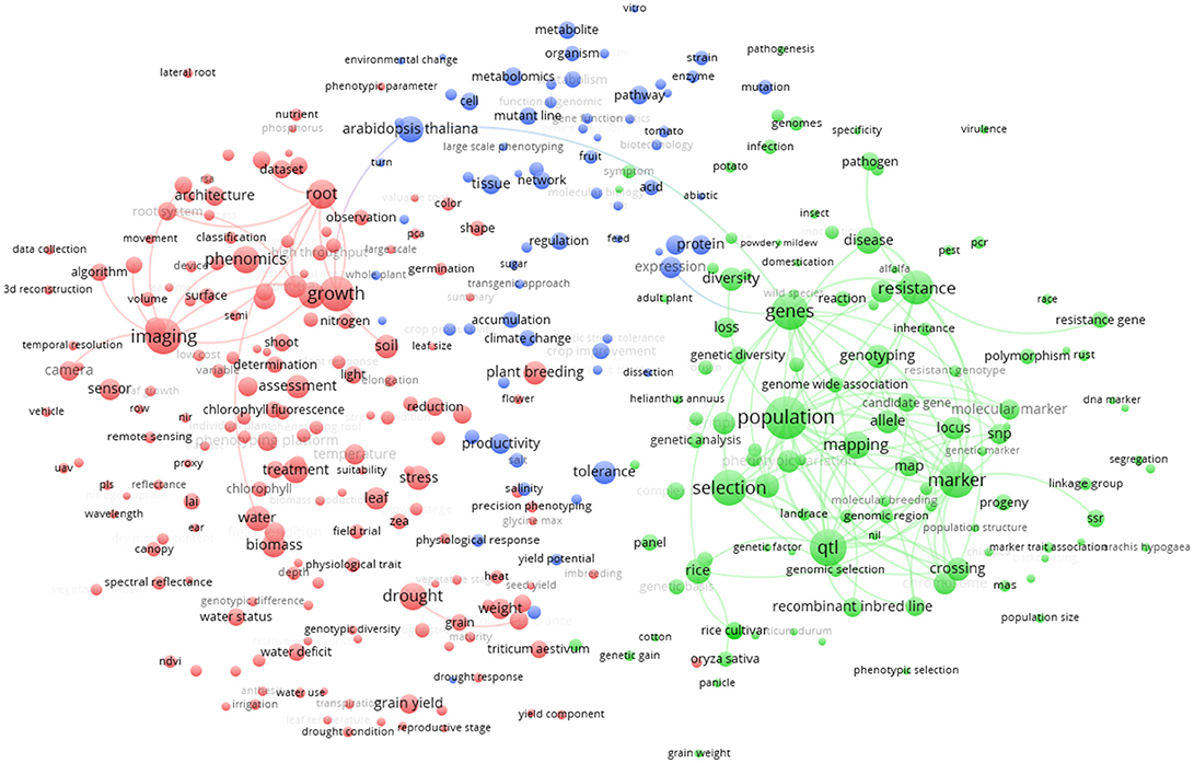Figure 5. Term clustering map based on the Scopus plant phenotyping publications. Different colors (red, green, blue) represent the terms belonging to different clusters. The size of the term is based on the number of occurrences. The connecting lines indicate the 100 strongest co-occurrence links between terms.