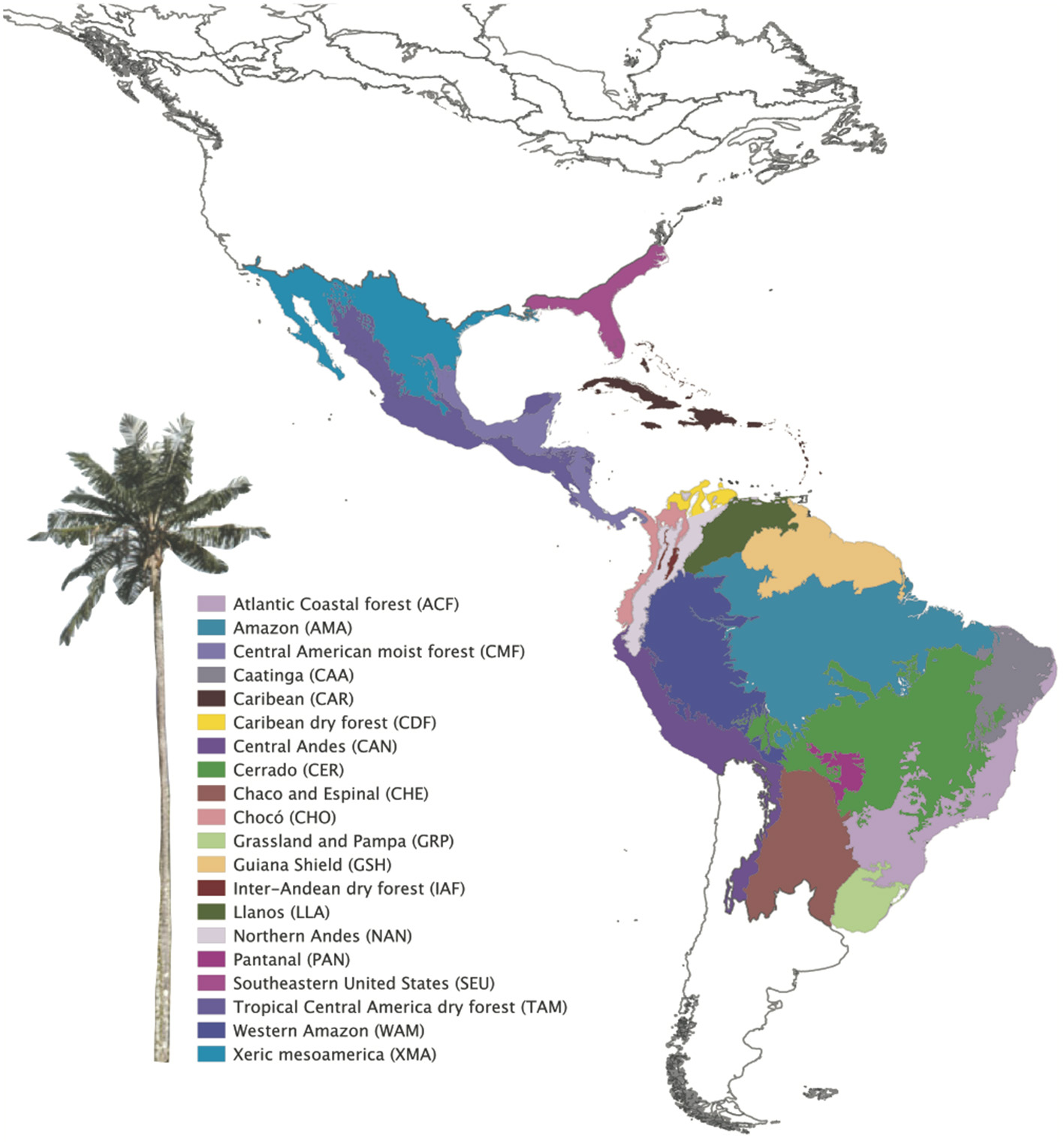 Regardless of the geographical distance or environment, bioregions shared similar over abundant clades (Figure 6). Seven areas with shared overabundant clades are adjacent and 13 are non-adjacent. For example, Atlantic Coastal forest (ACF) shared Butia with Cerrado (CER), Grassland and Pampa (GRP), and Chaco and Espinal (CHE), Syagrus + Lytocaryum + Allagoptera with Caatinga (CAA), Chaco and Espinal (CHE), and Cerrado (CER), but also shared clades with non-adjacent bioregions such as Amazonia (AMA) and Pantanal (PAN). CAA and CER shared clades with each other, but CAA shared Desmoncus + Acrocomia with the non-adjacent Pantanal (PAN) and Llanos (LLA) and part of Geonoma with Caribbean dry forests (CDF). Amazonia (AMA) also shared clades with adjacent bioregions such as Western Amazonia (WAM), Guiana Shield (GSH) and Caatinga (CAA), but also with non-adjacent ones such as Caribbean dry forest (CDF), Northern Andes (NAN), Choco (CHO), and Central Andes (CAN). Grasslands and Pampas (GRP) also shared the same species of Trithrinax with Caribbean (CAR), which had the most idiosyncratic clades, but also shared overabundant ones with non-adjacent bioregions such as Southern United States (SEU), Xeric Mesoamerica (XMA), and dry Tropical America (TAM; Appendix S5).