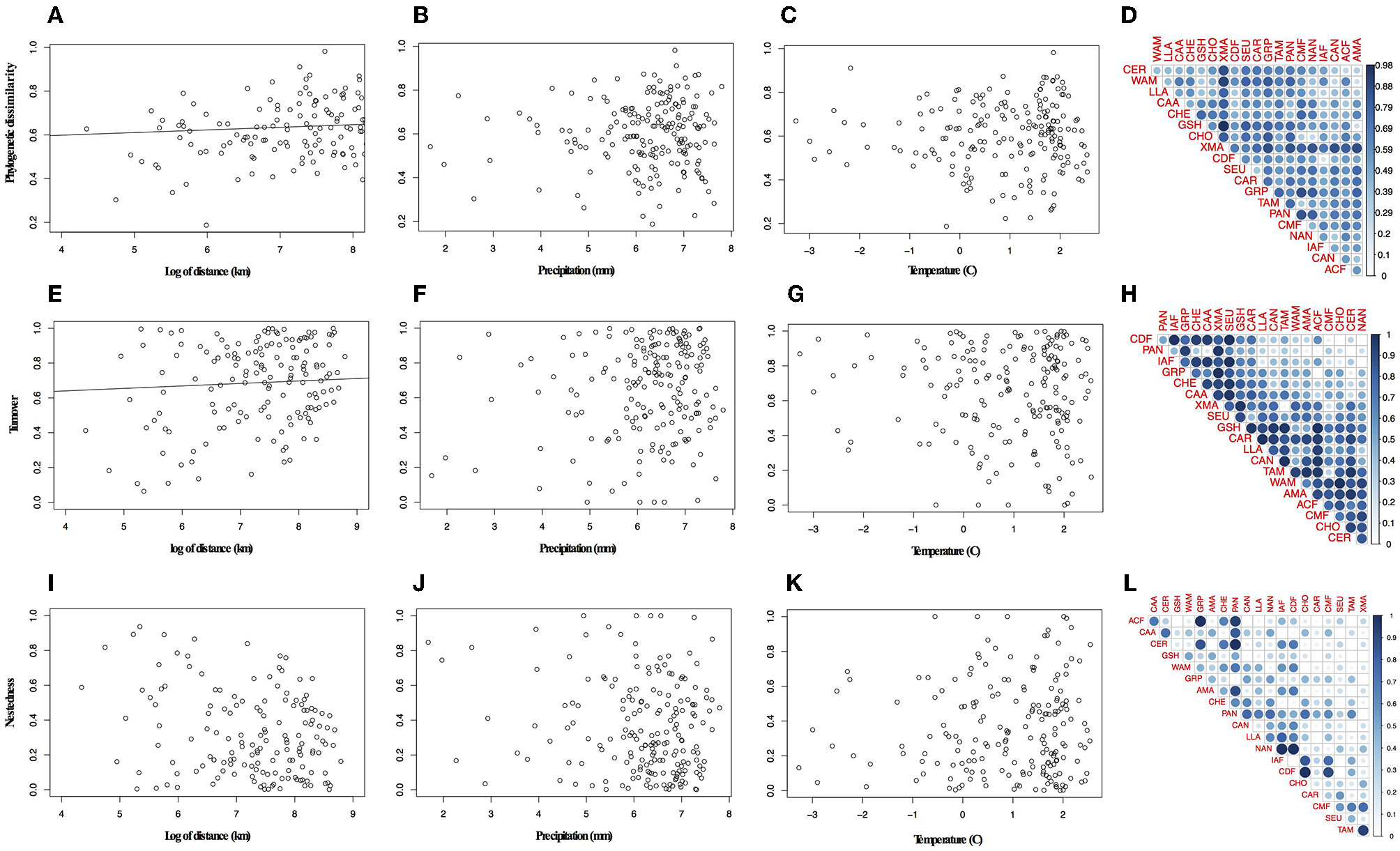 Relationship between phylogenetic dissimilarity and turnover component and distance. (A) Variation in phylogenetic dissimilarity with distance, (B) precipitation, (C) temperature, (D) pair-wise plot of the phylogenetic dissimilarity for bioregions. (E) Variation in turnover component with distance, (F) precipitation, (G) temperature, (H) pair-wise plot of the turnover component for bioregions. (I-L) In pair-wise plots the lateral blue bar represents the increasing of values represented in the graph.
