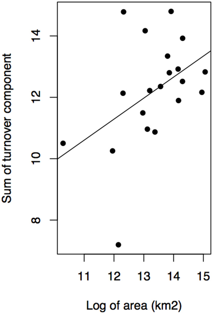 Contribution of turnover component of phylogenetic dissimilarity and bioregion area in kilometer square.