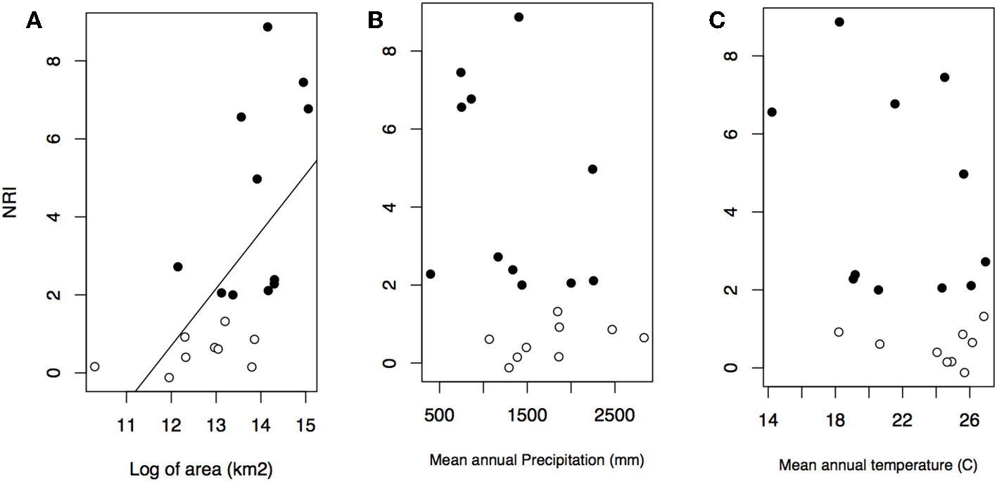 Relationship between NRI and bioregion area in kilometer square (A), mean annual precipitation (B), and mean annual temperature (C). Black dots represent significant values of NRI.