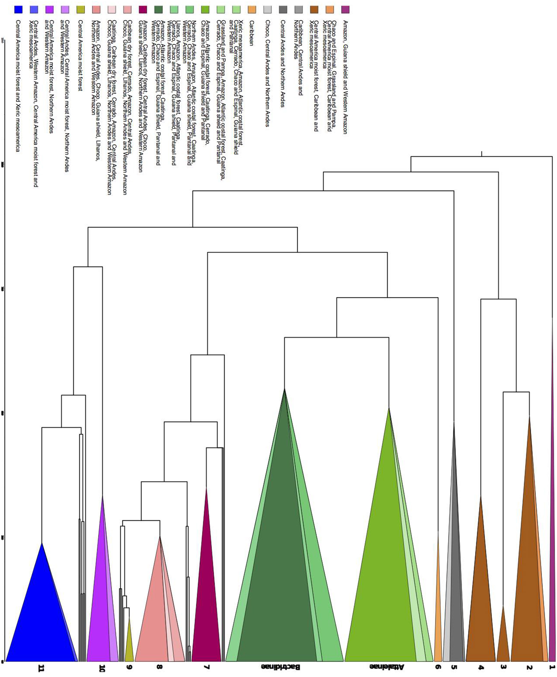 Chronogram representing the major clades that are significantly over abundant in the Nodesig analysis. The groups are as it follows, 1–Raphiinae, Mauritiinae, and Lepidocaryeae, 2–Crysophileae, detail of Trithrinax, 3–Sabal, 4–Unplaced Trachycarpeae, 5–Detail of Pseudophoenix, detail of Phytelepheae, Ceroxyloideae and Cyclospatheae, and detail of Aphandra, Ammandra, and Phytelephas, 6–Roystonea, Subtribe Attaleinae, detail of Butia, Subtribe Bactridinae detail of Aiphanes, Bactris and Desmoncus, 7–Euterpeae, 8–Geonoma, 9–Calyptrogyne, 10–Iriarteeae, detail of Socratea and Iriartella, 11–Chamadoreeae. Color represents sets of biomes where those major clades were overabundant (Appendix S5).