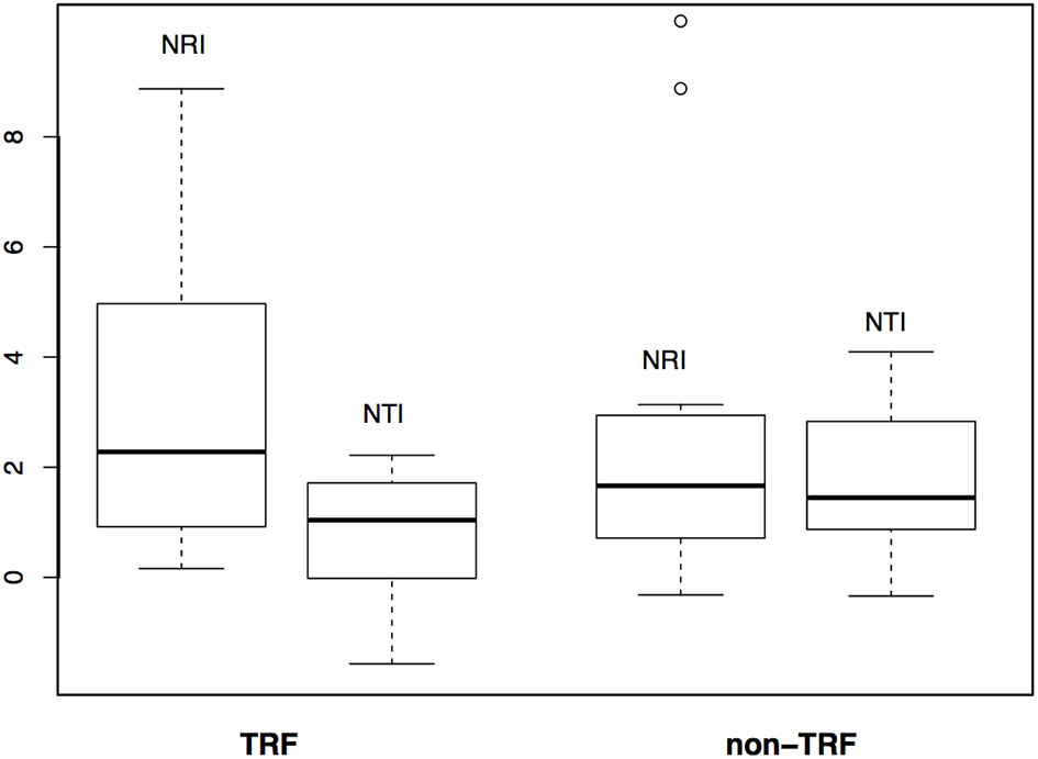 Comparison of phylogenetic structure between tropical rain forest (TRF) and non-tropical rain forest (non-TRF) bioregions based on NRI (Net Relatedness Index) and NTI (Nearest Taxon Index) values.