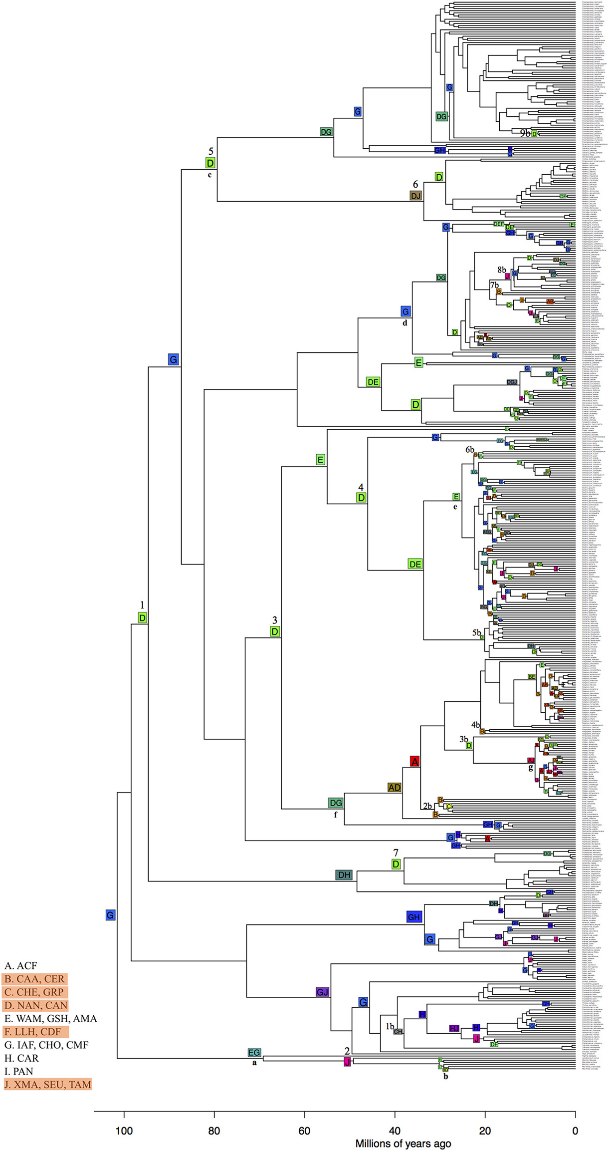 TRFs such as the Central American moist forest (CMF), Inter-Andean forest (IAF) and Choco (CHO, G) are the most likely ancestral bioregions of Neotropical palms (Figure 9). We found more transitions from different bioregions, such as TRF to non-TRF bioregions (31) and non-TRF to TRF (24) than to similar bioregions, like TRF to TRF (11) and non-TRF to non-TRF (9). From 100 to 40 Ma there were seven transitions from TRF bioregions to non-TRF (clades 1–7 in Figure 9). The most ancient clade of Neotropical palms comprising Mauritia and Mauritiella spread out of the center of origin (G) northwards to more xeric regions and southwards into Amazonia (Figure 9, clade a) with later colonization of other xeric areas within South America (Caatinga and Cerrado; clade b). Chamaedoreeae, Geonomateae and Iriarteae originated in the Northern and Central Andes, non-TRF bioregions, more than 80 Ma (D; clade c, Figure 9), and later colonized the Inter-Andean forests, Choco and Central American moist forests (G), and drier areas in North (J) and north of South America (F). Geonomateae, mainly represented by Geonoma, originated in the Inter-Andean, Central American moist forest and Choco (G; clade d) colonized later the Atlantic forest (A) and Cerrado and Caatinga (B). Cocoseae originated in the Amazonia (E) and Northern and Central Andes (D; clade x). Bactridinae also originated in Amazonia (E; clade e) and recently (c. 20 Ma) colonized the Atlantic Coastal forest (A), and non-TRFs such as Cerrado, Caatinga (B), Northern and Central Andes (D) and the xeric regions of North America (J). Attaleinae (clade f) originated in the Central America moist forest, Inter-Andean forest and Choco (G) and Northern and Central Andes (D) and later (c. 40 Ma) colonized the Atlantic Coastal forest (A) and Cerrado and Caatinga (B), represented by Allagoptera, and into Grasslands and Pampa (C) represented by Butia. And finally, Attalea had a recent and widespread colonization pattern (clade g).