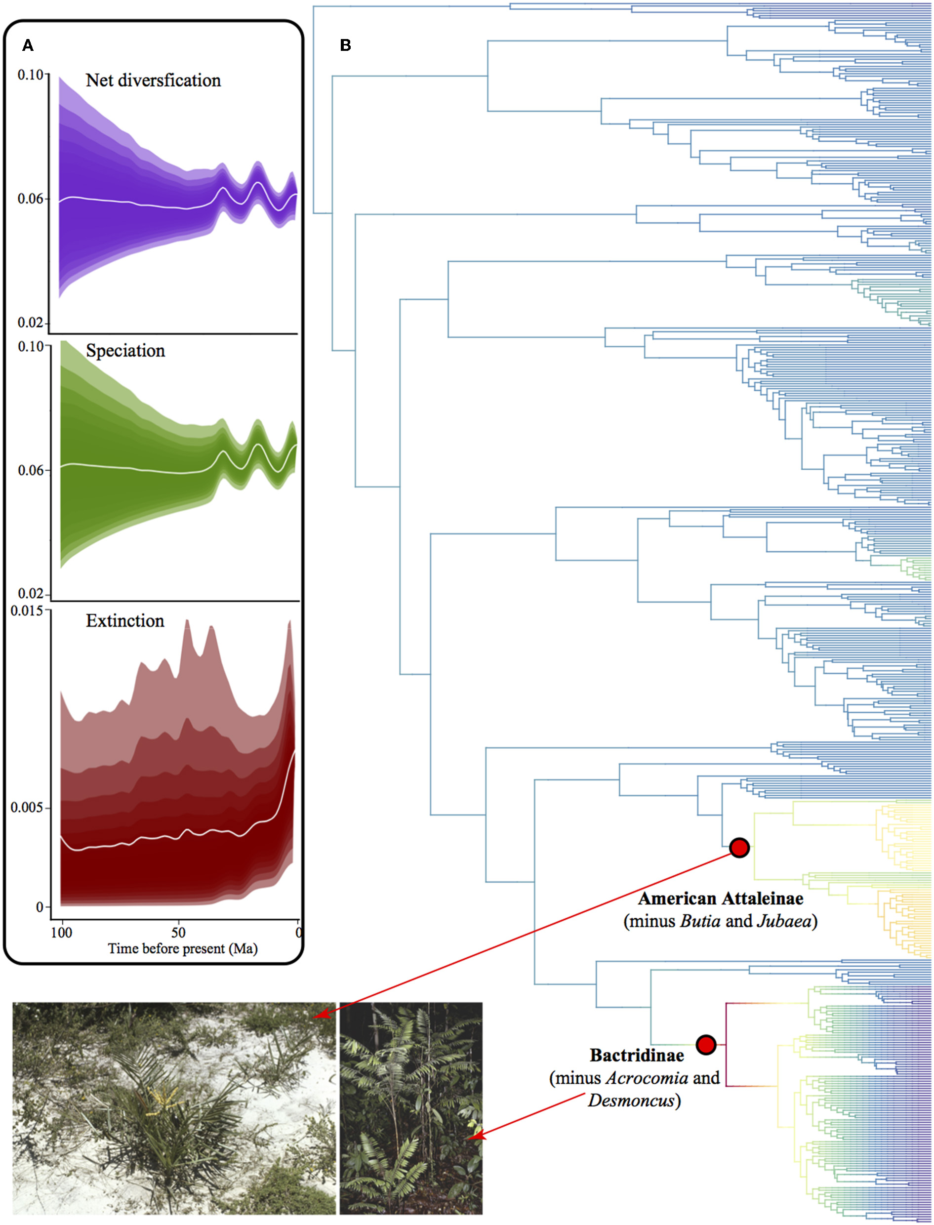 Diversification in American palms. (A) Phylorate plot of net diversification rates showing rates through time for net diversification, speciation, and extinction, where the shades comprise 95% of the data. (B) Phylogenetic tree of American palms depicting clades with shifts in diversification rates. Red dots represent the most probable rate shift configuration in the phylogenetic tree and indicate a rate increase. Photographs from palmweb.org showing the diversity of the clades involved in rate shifts, such as the species-rich genera Bactris and Syagrus that represent drastically different bioregions.