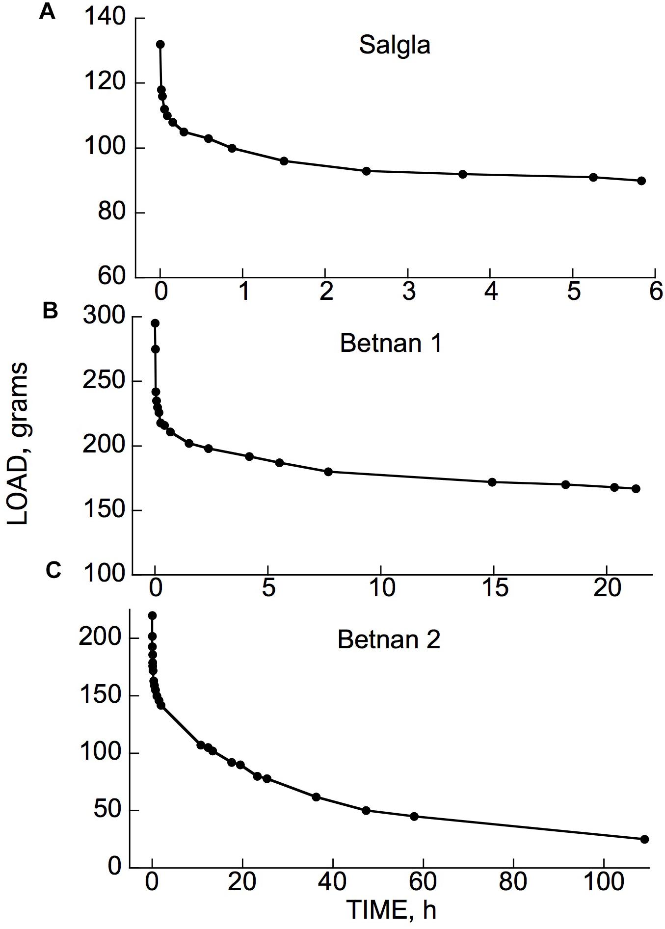 Figure 5. Stress relaxation in cantilever-loaded branch segments from (A) Salix glauca (“Salgla”) and (B,C) Betula nana (“Betnan”). After initial load was applied (first marker point), the branches were kept at the thereby-imposed deflection of about 4 cm while the load that maintained this deflection was recorded. A repeat run using the branch segment in (B) gave an almost identical time course. (C) Is for a different branch than that in (B). Note the offscale ordinate zero-load points for the plots (A,B), showing that (unlike C) the load remained far above zero at the end of the experiment, when virtually no further relaxation was occurring.