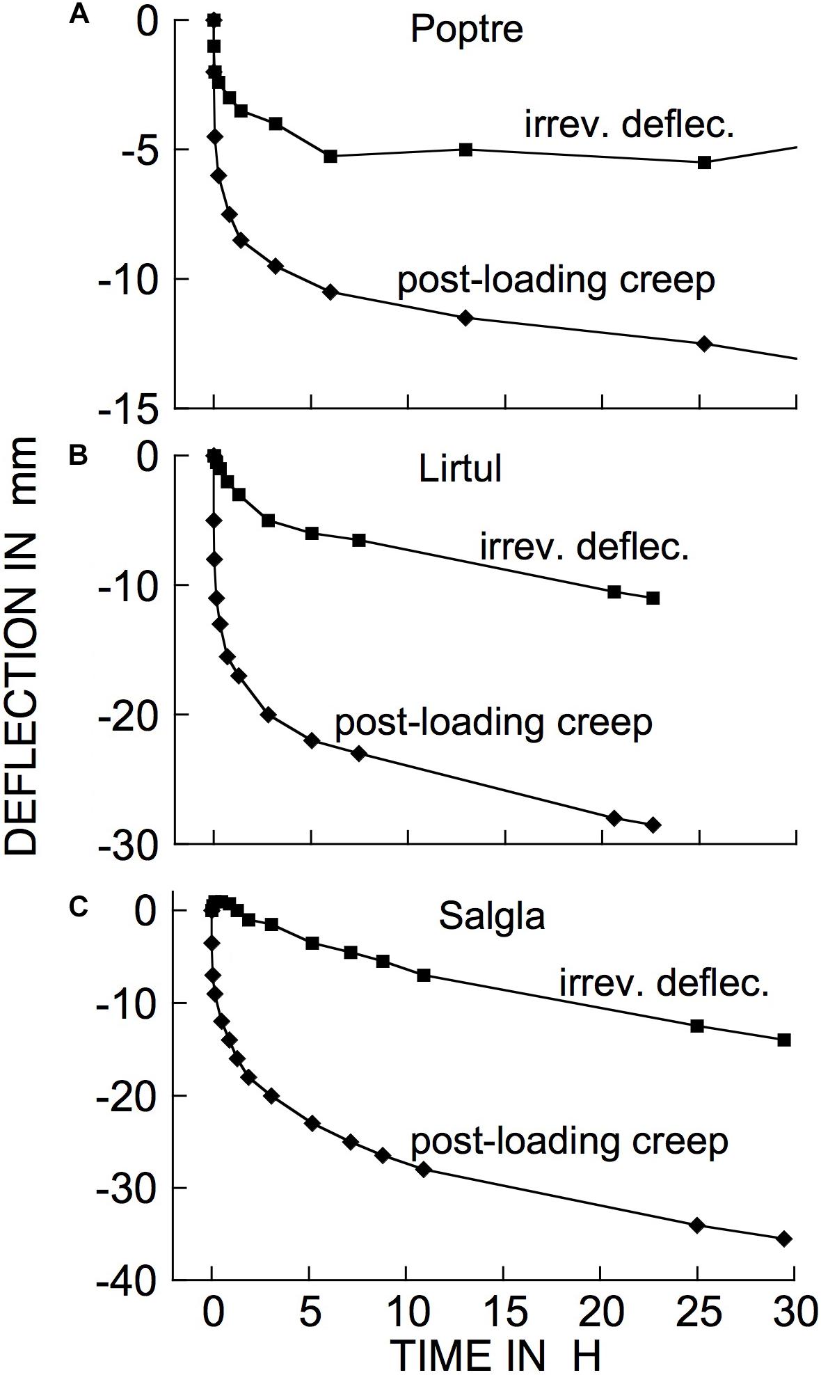 Figure 9. Time courses of irreversible bending (upper curves in each panel) for three species, deduced by subtracting, from the post-loading creep curve (lower curve in each panel), the progress curve for post-unloading retarded recovery (difference between the two curves). Plots begin with the first data point after loading (therefore do not show the instantaneous deflection). (A) Populus tremuloides (“Poptre”); (B) Liriodendron tulipifera (“Lirtul”); (C) Salix glauca (“Salgla”).