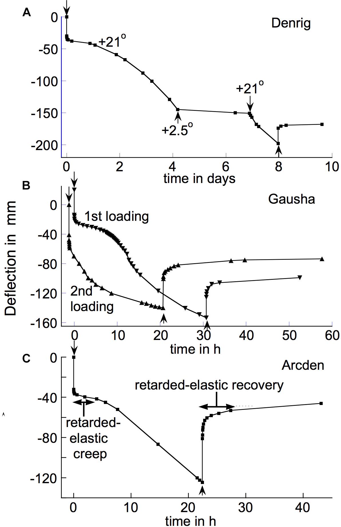 (c) A time-dependent additional bending (“creep”) of gradually declining rate that in most cases reached completion within about 24 h, but sometimes only declined by that time to a low but non-zero rate.