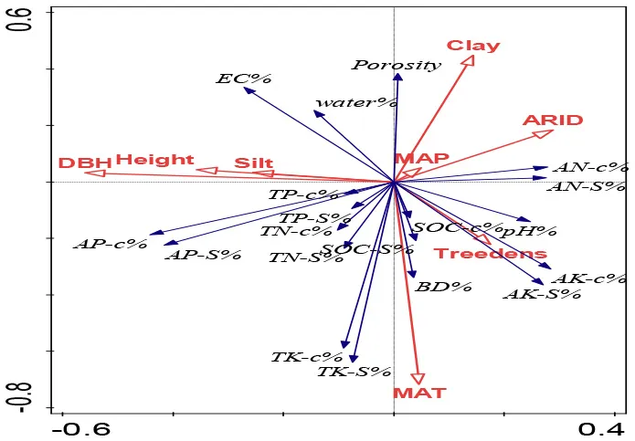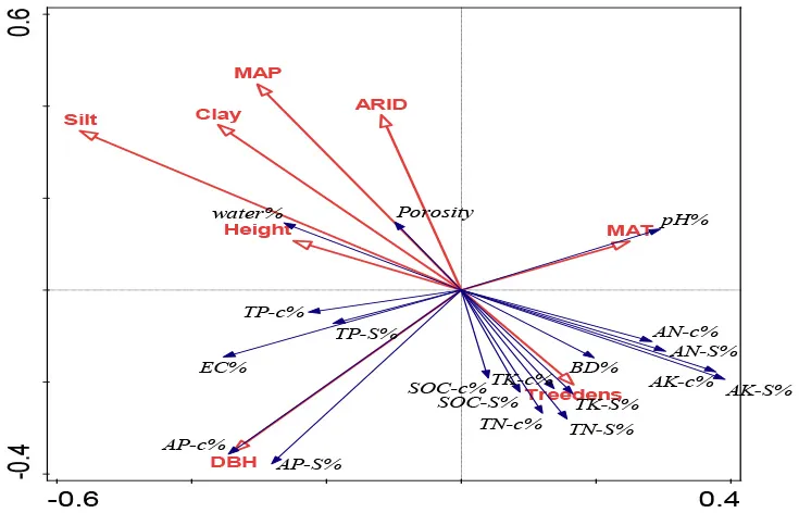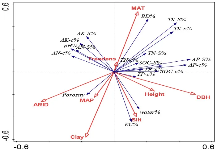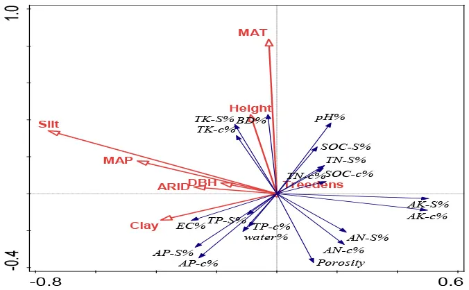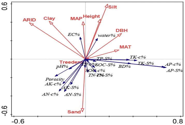 Redundancy analysis (RDA) was conducted to ordinate the complex associations between shelterbelt-induced variations in various soil properties and climatic conditions, soil texture, and forest characteristics (Canoco 5.0 software program). Ordination was performed in all five soil-depth profile, as we wanted to find the differences in different soil depths. Conditional term effects (excluding collinear effects among different dependent parameters) were derived from the RDA, and the possible factors contributing to the dependent variables (e.g., shelterbelt-forest-induced changes in soil properties as a whole). In conditional term effects, the significant factor with the highest explanation percentage showed the strongest contribution to the variation of soil properties. Details explaining the RDA ordination can be found in previous studies (Wang et al., 2017b, 2018b).