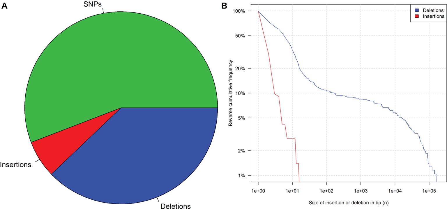 Figure 1. Mutation frequency in 41 rice plants after irradiation and three generations of propagation. (A) Pie chart of SNPs, insertions, and deletions. (B) Reverse cumulative frequency distribution of indels that are at least n base pairs long. Data from Li et al. (2016), supplementary.