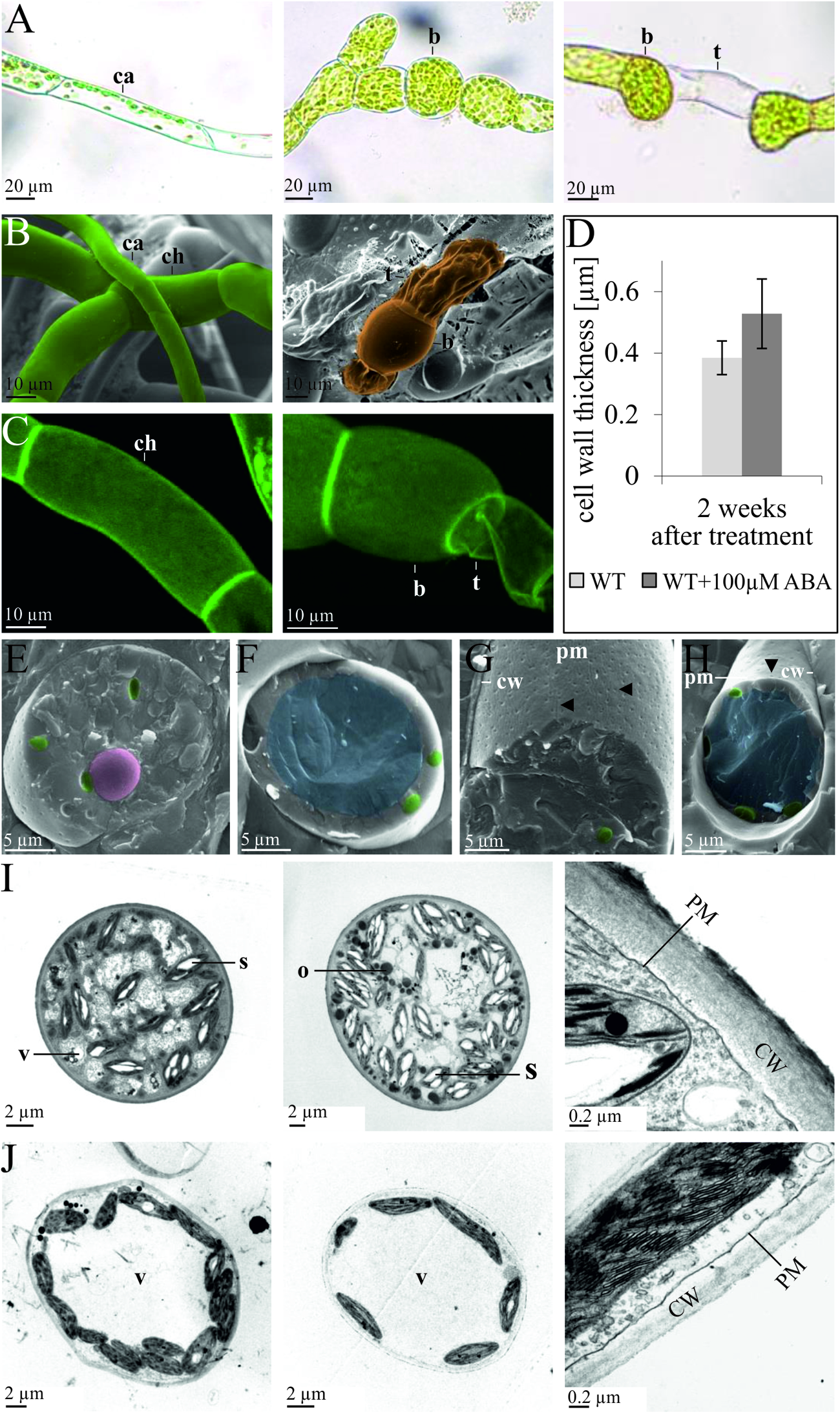 Figure 1. Developmental changes of protonema upon exogenous ABA application. Comparison of protonema before and after ABA application observed via (A) light microscopy, (B) cryo scanning electron microscopy (SEM), and (C) confocal microscopy after propidium iodide staining. The left column shows chloronema (ch) and caulonema (ca) cells prior to ABA application, while the middle and right columns show brachycytes (b, rounded brood cells) and tmema cells (t, preformed filament breaking points) 2 weeks after exogenous application of 100 μm ABA. (D) The bar chart shows average cell wall thickness in μm (measured from TEM sections) after 2 weeks of culture without (WT) and with (WT + 100 μm ABA) treatment. Error bars show standard deviation (n = 11); the difference is significant (two-sided t-test, p < 0.01). (E–H) Ultrastructural changes upon exogenous ABA application, cryo-SEM. Images are false colored: nucleus (pink), chloroplasts (green), and central vacuole (blue). Cryo-SEM after freeze breaking and etching; (E,G) 2 weeks 100 μm ABA, (F,H) mock control. In (E,F) the cell is broken perpendicular, in (G,H) the cell wall (CW) has been removed, allowing to see the plasma membranes’ (PM) outer surface. The central vacuole (blue) clearly visible in (F,H) is not recognizable in (E,G). ABA-treated cells exhibit more furrows and a denser patterns of depressions (marked by arrows) that most probably represent negatives (relief) of cellulose synthase complexes. (I,J) Ultrastructural changes upon exogenous ABA application, transmission electron microscopy (TEM) images of epon embedded, Osmium-stained cells. (I) Five weeks 100 μm ABA, (J) without ABA. Intracellular structures are labeled as follows: vacuole (V), starch granules (S), oleosomes (O), plasma membrane (PM), cell wall (CW).