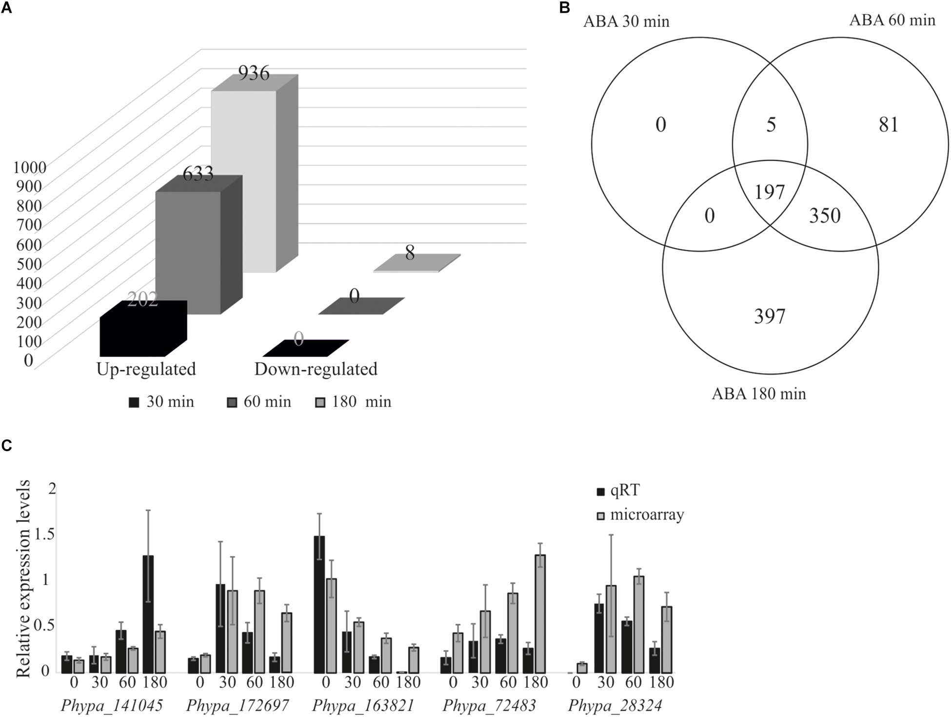 Figure 2. Analysis of ABA-responsive genes and microarray data validation by quantitative real-time PCR. Differentially expressed genes from P. patens protonema in response to exogenously applied 10 μM ABA. (A) Differentially expressed genes after 30, 60, and 180 min of ABA treatment. (B) Venn diagram of ABA-responsive genes after 30, 60, and 180 min of ABA treatment. (C) Validation of microarray data by qRT-PCR; expression values were normalized to the reference gene PpEF1α (Le Bail et al., 2013). Error bars indicate standard deviation calculated from three biological replicates. The values from the microarray experiments were scaled down by the indicated factors to fit to the qRT-PCR scale: Phypa_141045, Phypa_172697, and Phypa_163821 by 104; Phypa_72483, Phypa_28324 by 103.