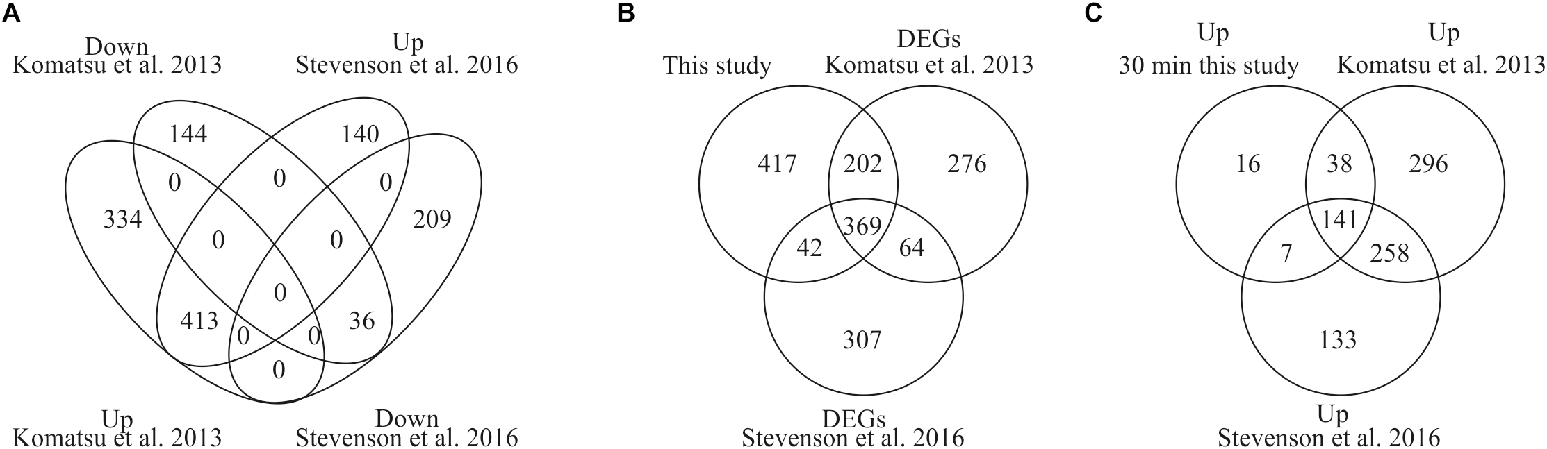 Figure 3. Comparison of DEGs with previously published studies. (A) Venn diagram depicting the overlap of DEGs from our study and two previously performed studies by Stevenson et al. (2016) and Komatsu et al. (2013). (B) Comparison of all our DEGs with both studies. (C) Unique identification of early induced genes by our study.