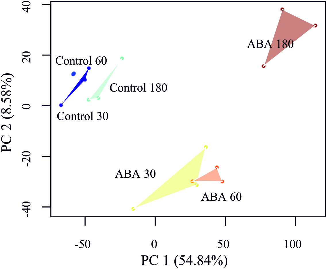 Figure 5. Principal component analysis (PCA) of the P. patens transcriptome time series. Replicates have been linked by a convex hull to visualize the sample distances.