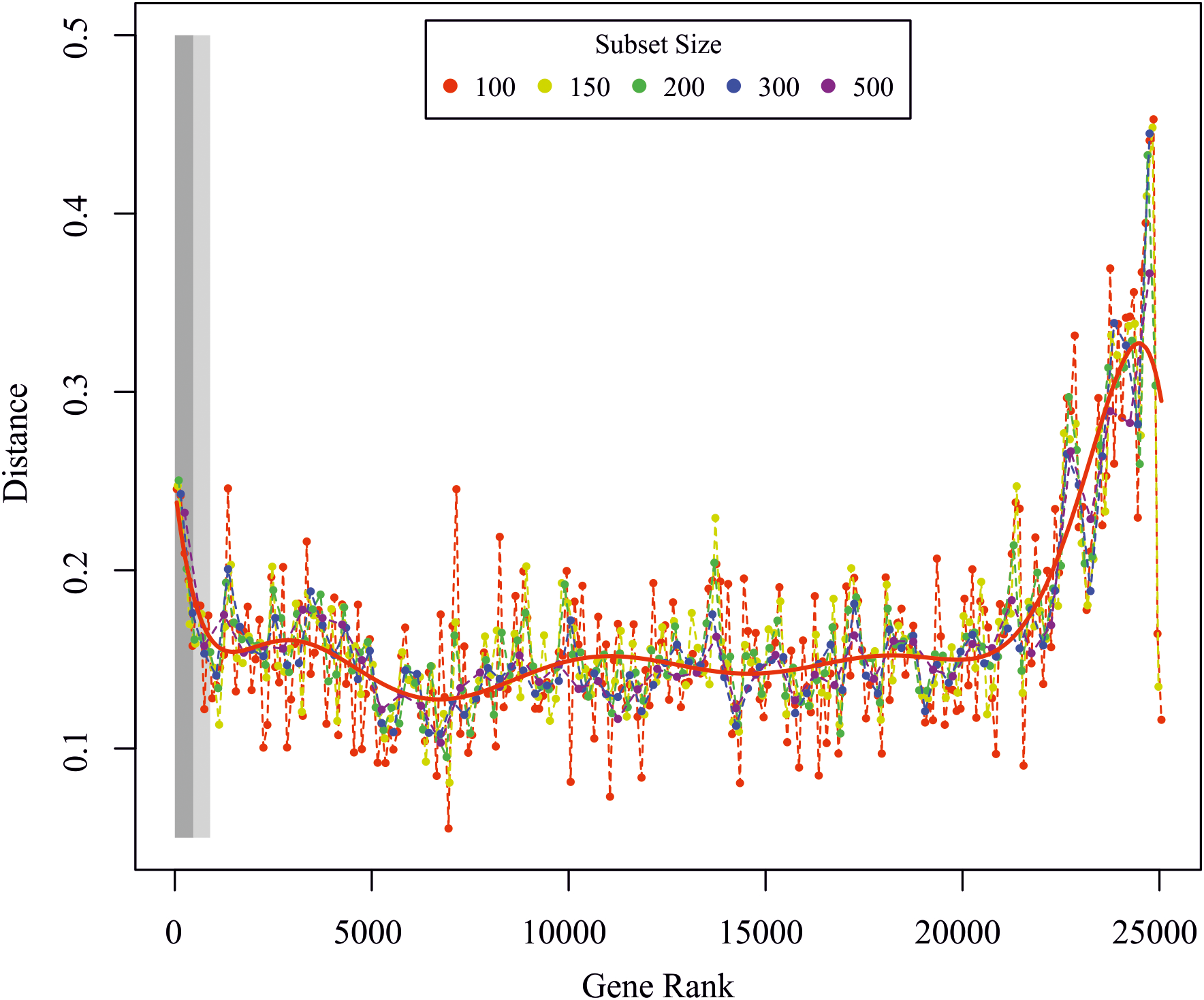 Figure 6. Global transcriptome analysis. Euclidean distance between the global and ordered gene subset response for subsets of different sizes. The red line is a polynomial fit to all data points. The light and dark rectangles depict the significantly regulated genes from the F-test for the FDR corrected p-values < 0.01 and <0.05, respectively. Genes were ranked according to the p-value from the F-test analysis.